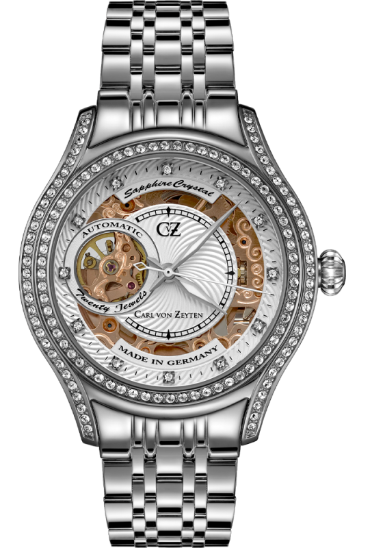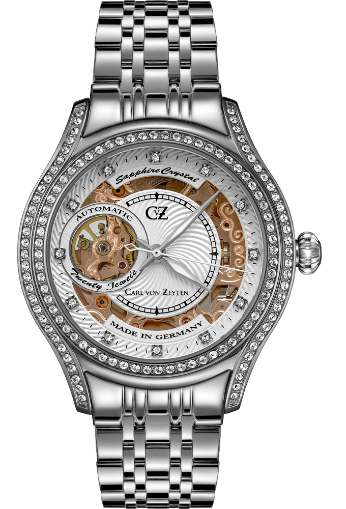 Женские наручные часы Carl von Zeyten CVZ0069WHMS из коллекции Baden-Baden представляют собой изысканный автоматический скелетон, сочетающий немецкую ювелирную точность и нежный дизайн. Модель оснащена надежным механизмом с автоподзаводом на 20 камнях, работу которого можно наблюдать через открытое «окошко» на перламутровом циферблате, украшенном сверкающими кристаллами вместо часовых меток. Стальной корпус диаметром 38 мм дополнен элегантным браслетом миланского плетения из нержавеющей стали, который мягко облегает запястье и регулируется по размеру. Часы защищены устойчивым к царапинам сапфировым стеклом, имеют прозрачную заднюю крышку и базовую водозащиту 3 ATM, что делает их роскошным и практичным аксессуаром для повседневного или вечернего образа.