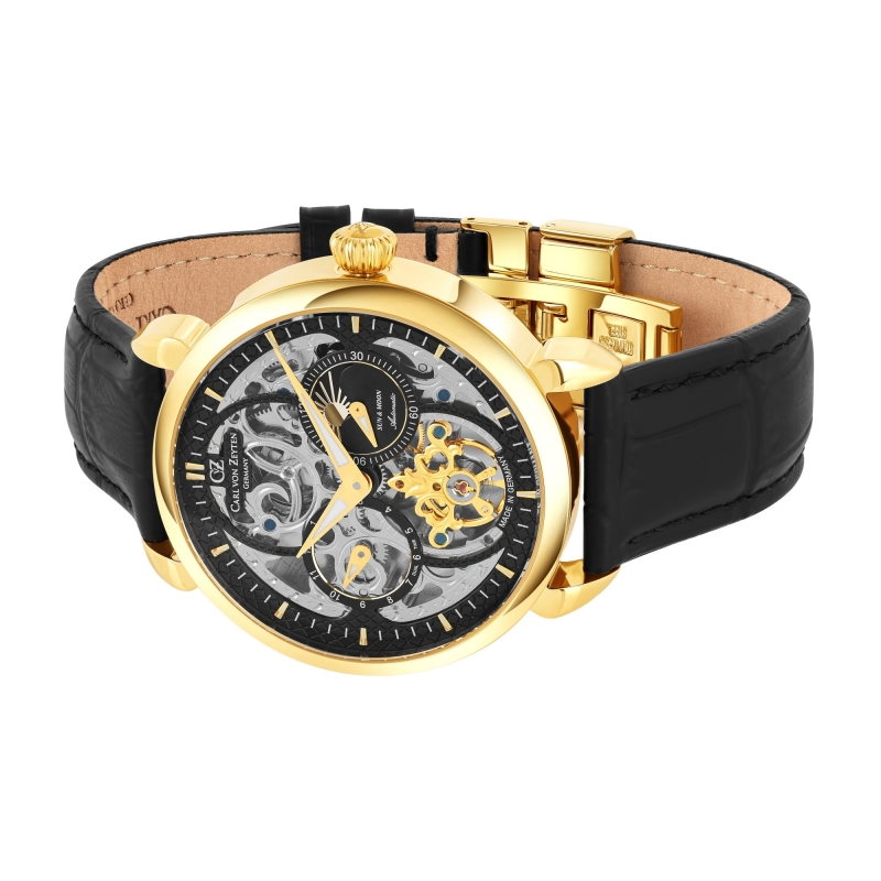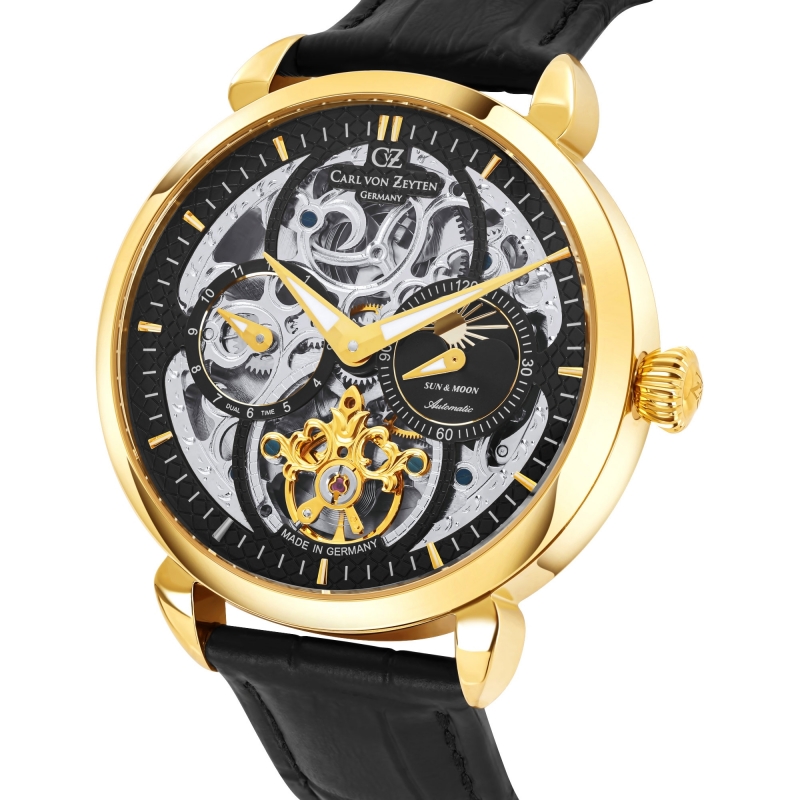 Модель Carl von Zeyten CVZ0005GBKS из коллекции Neukirch представляет собой монументальный мужской скелетон, который отличается от более простых версий наличием полноценного сапфирового стекла, практически не подверженного царапинам. Крупный корпус диаметром 45 мм с золотистым PVD-покрытием придает часам премиальный вид, а открытый механизм калибра 415 позволяет детально наблюдать за работой каждой шестеренки. Помимо эстетики, часы функциональны: они оснащены индикатором второго часового пояса и наглядным указателем «день/ночь» с изображением солнца и луны. Это идеальный выбор для тех, кто предпочитает массивные, заметные аксессуары с усложнениями, в которых сочетаются классические традиции немецкого часового искусства и современная надежность материалов.