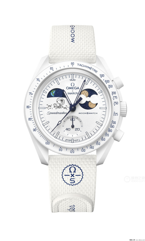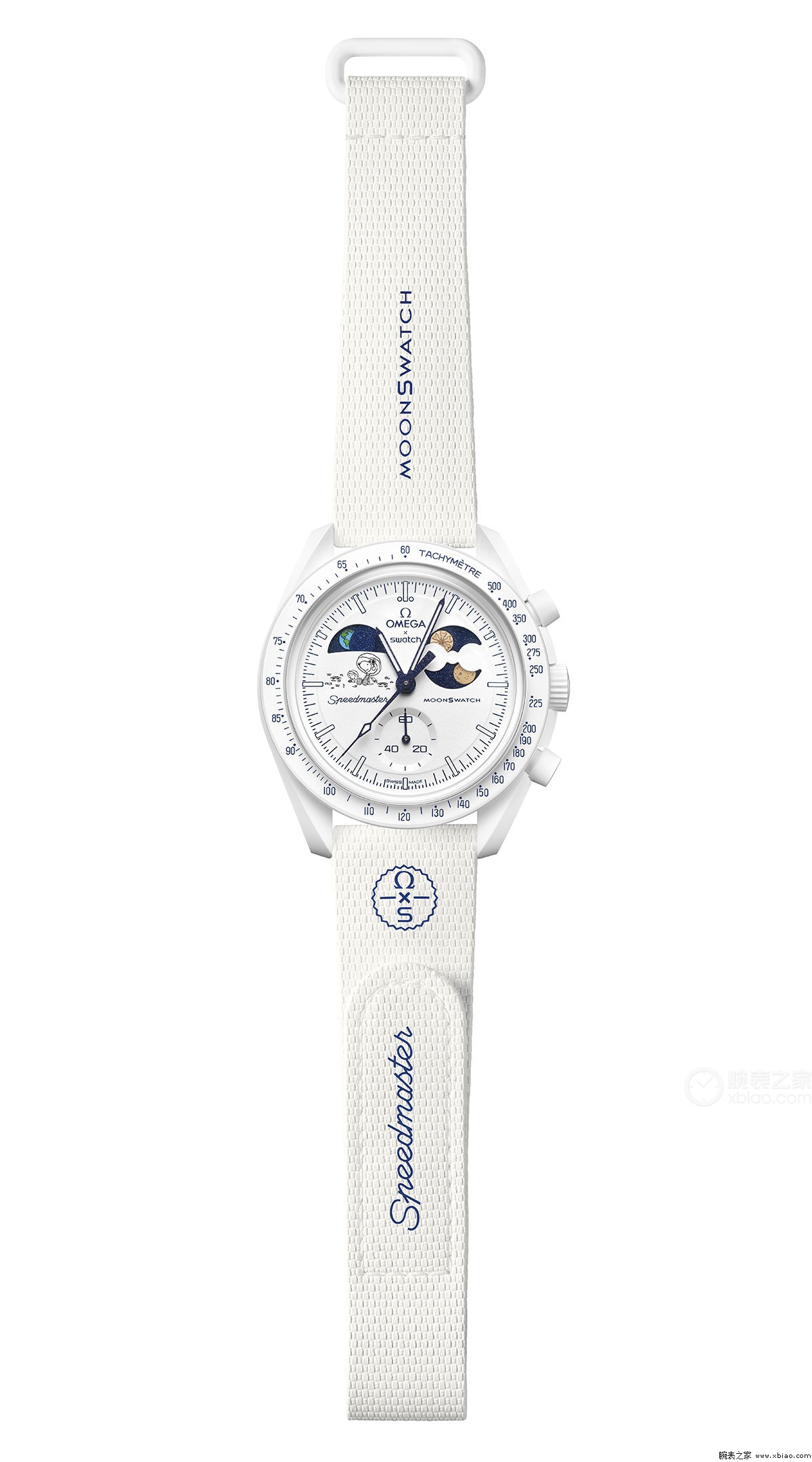 Этот хронограф заключен в белый корпус из биокерамики с такими же заводной головкой и кнопками-пушерами и закреплен на каучуковом ремешке белого цвета с биокерамическим тренчиком. Часовые отметки на молочно-белом циферблате покрыты люминесцентным составом Super-LumiNova® класса А (с зеленым свечением). На индикаторе фаз Земли, расположенном возле отметки 10 часов, при ультрафиолетовом свете можно различить голубые океаны. Под индикатором фаз Земли изображены персонажи комикса Snoopy и Woodstock, любующиеся с Луны восхитительным видом Земли. На картинке также присутствует надпись, видимая только при ультрафиолетовом свете. В области отметки 2 часа размещен дополнительный циферблат указателя фаз Луны с двумя сияющими золотистыми лунами с покрытием из OMEGA’s Moonshine™ Gold. Уникальное оформление придает самобытность каждому экземпляру: подобно снежинкам, невозможно найти два абсолютно одинаковых часов.