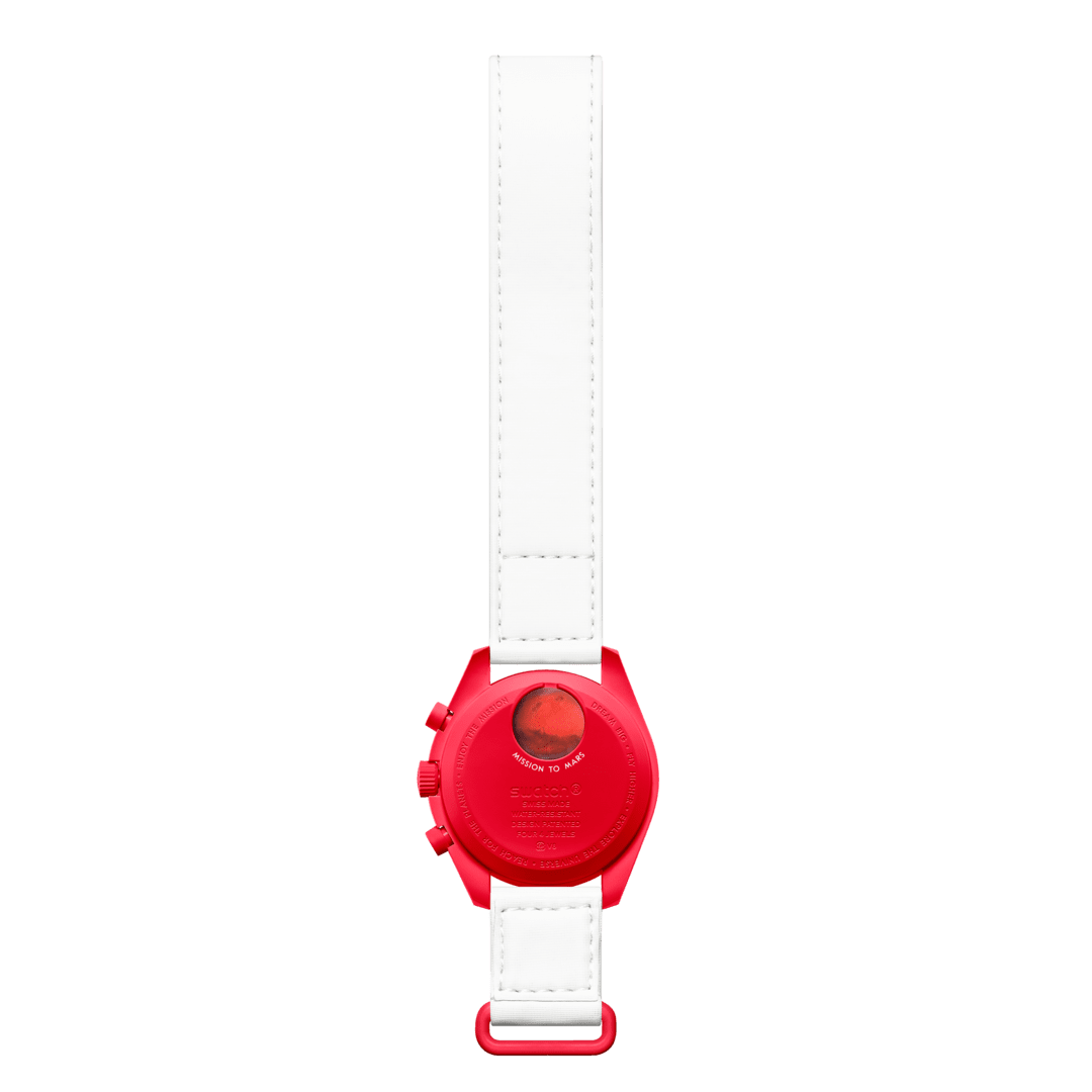 Белый безель оснащён чёрной тахиметрической шкалой. На циферблате — логотипы OMEGA X Swatch, Speedmaster и MoonSwatch. Стекло изготовлено из биоматериалов и украшено выгравированной буквой «S», внешнее кольцо имеет тонкий круговой узор, а субдисплеи — утопленные. Ушки корпуса — гладкие и угловатые, присутствует культовая деталь «dot over 90». Биокерамический корпус дарит фирменное тактильное ощущение коллекции.