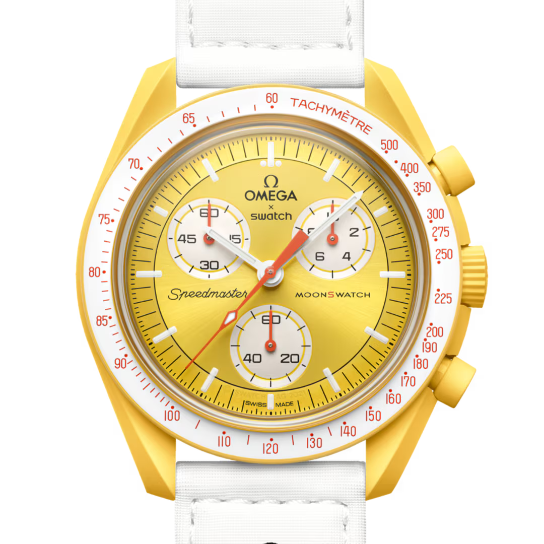 Циферблат украшен логотипами OMEGA X Swatch, Speedmaster и MoonSwatch. Стекло из биоматериалов с выгравированной буквой «S», тонкий круговой узор на внешнем кольце, утопленные субдисплеи, гладкие угловатые ушки корпуса и культовая «dot over 90» — узнаваемые атрибуты всей коллекции. Биокерамический корпус обеспечивает фирменное ощущение MoonSwatch.