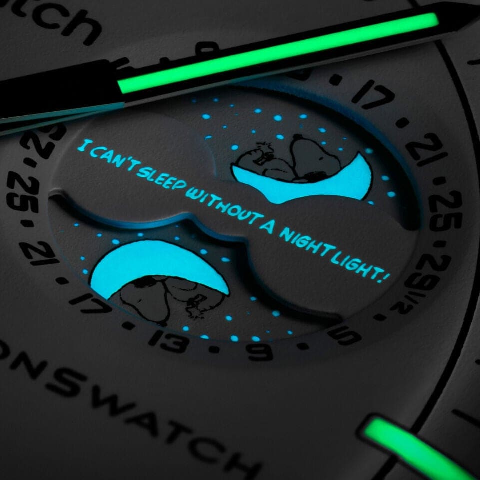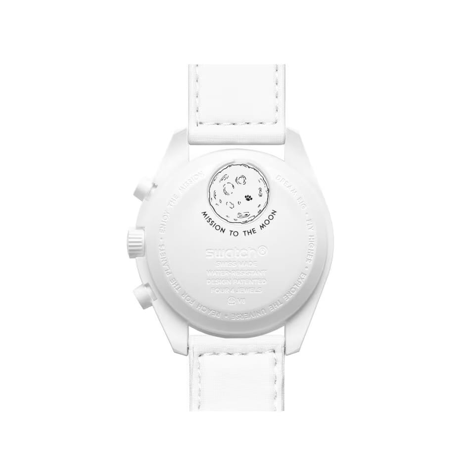 Эта нелимитированная модель, посвященная полнолунию, отличается полностью белой цветовой гаммой. Она оснащена биокерамическим корпусом, заводной головкой и кнопками, а также ремешком VELCRO®. Секундная стрелка хронографа, стрелки дополнительных циферблатов и тахиметрическая шкала выполнены в черном цвете. Дополнительные циферблаты и безель белого цвета. Эта модель выделяется функцией фазы Луны, пожалуй, самой поэтичной из всех усложнений часов. Снупи, который с 1960-х годов ассоциируется с космическими миссиями человека, изображен лежащим на Луне на диске фазы Луны, который вращается на дополнительном циферблате, расположенном в положении «2 часа». Под ультрафиолетовым светом на уникальном субциферблате появляется скрытая цитата из комикса о Снупи, расположенная среди полумесяцев и звезд. Все циферблаты в коллекции имеют логотип OMEGA X Swatch, культовый логотип Speedmaster и логотип MoonSwatch. Все модели имеют одинаковую конструкцию: прямоугольную форму корпуса из биоматериала, выгравированную букву «S» в центре стекла, отсылающую к логотипу Swatch, изысканный круговой узор на внешнем кольце циферблата и утопленные дополнительные циферблаты, четкую и гладкую конструкцию ушек, знаковую деталь «точка над 90» на тахиметрической шкале и, конечно же, уникальную биокерамическую поверхность. Индексы, часовая и минутная стрелки, а также секундная стрелка хронографа покрыты Super-LumiNova® класса A для идеального свечения в темноте.