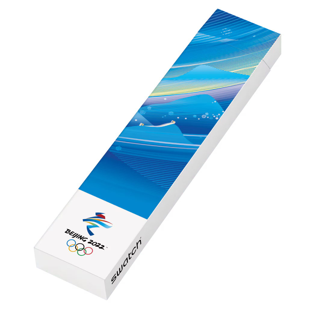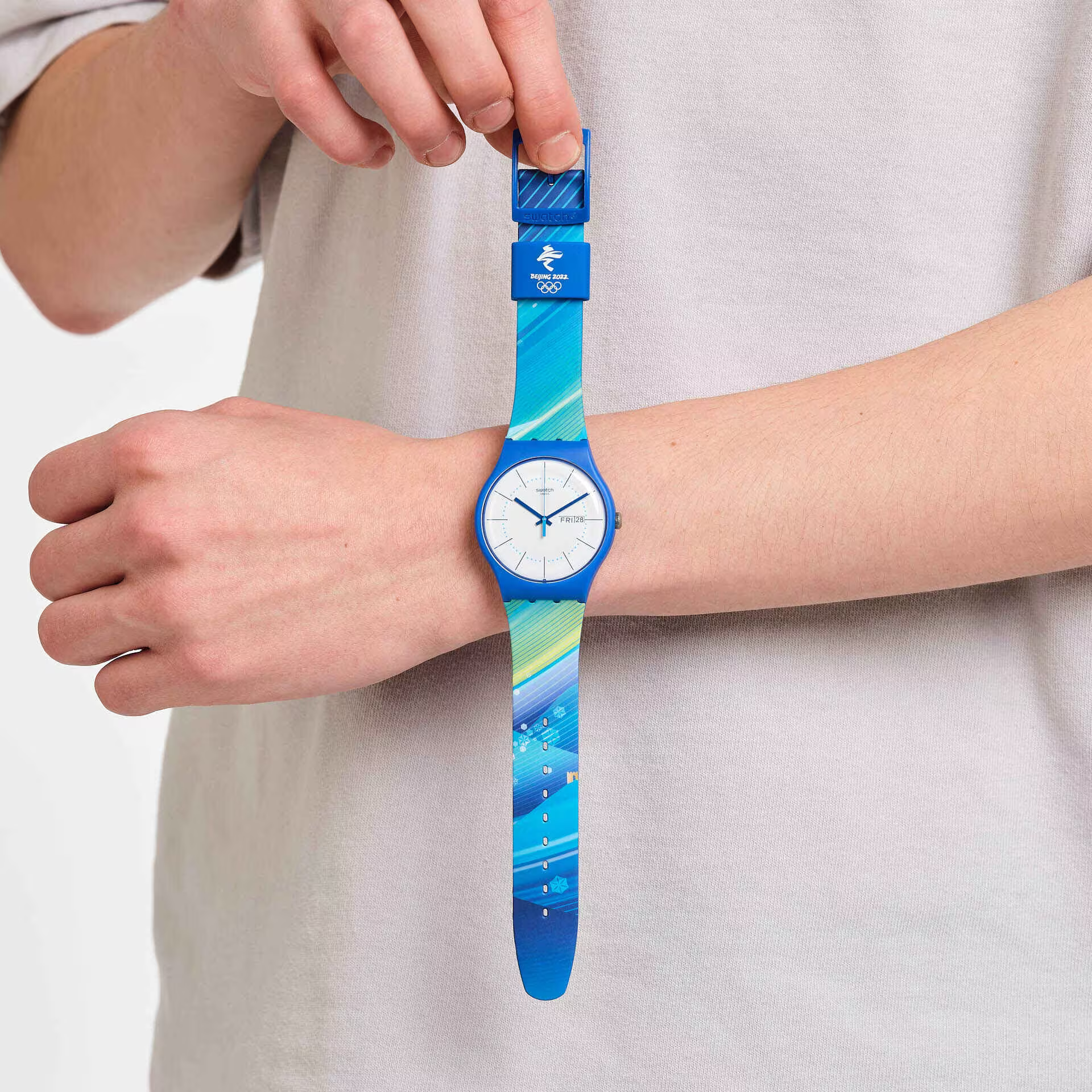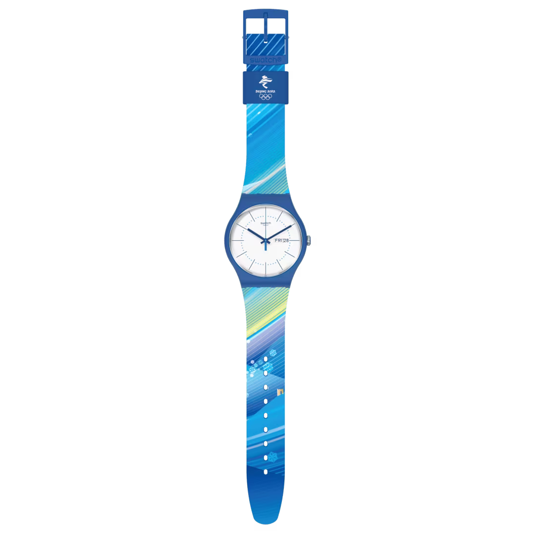 Эти олимпийские часы завоевали золото благодаря синему матовому корпусу из биоматериалов, синему силиконовому ремешку с зимним принтом и белому циферблату с синими индексами.