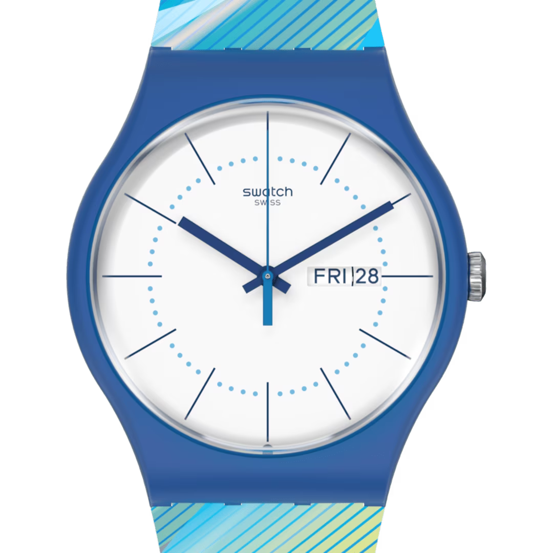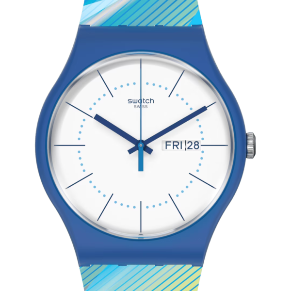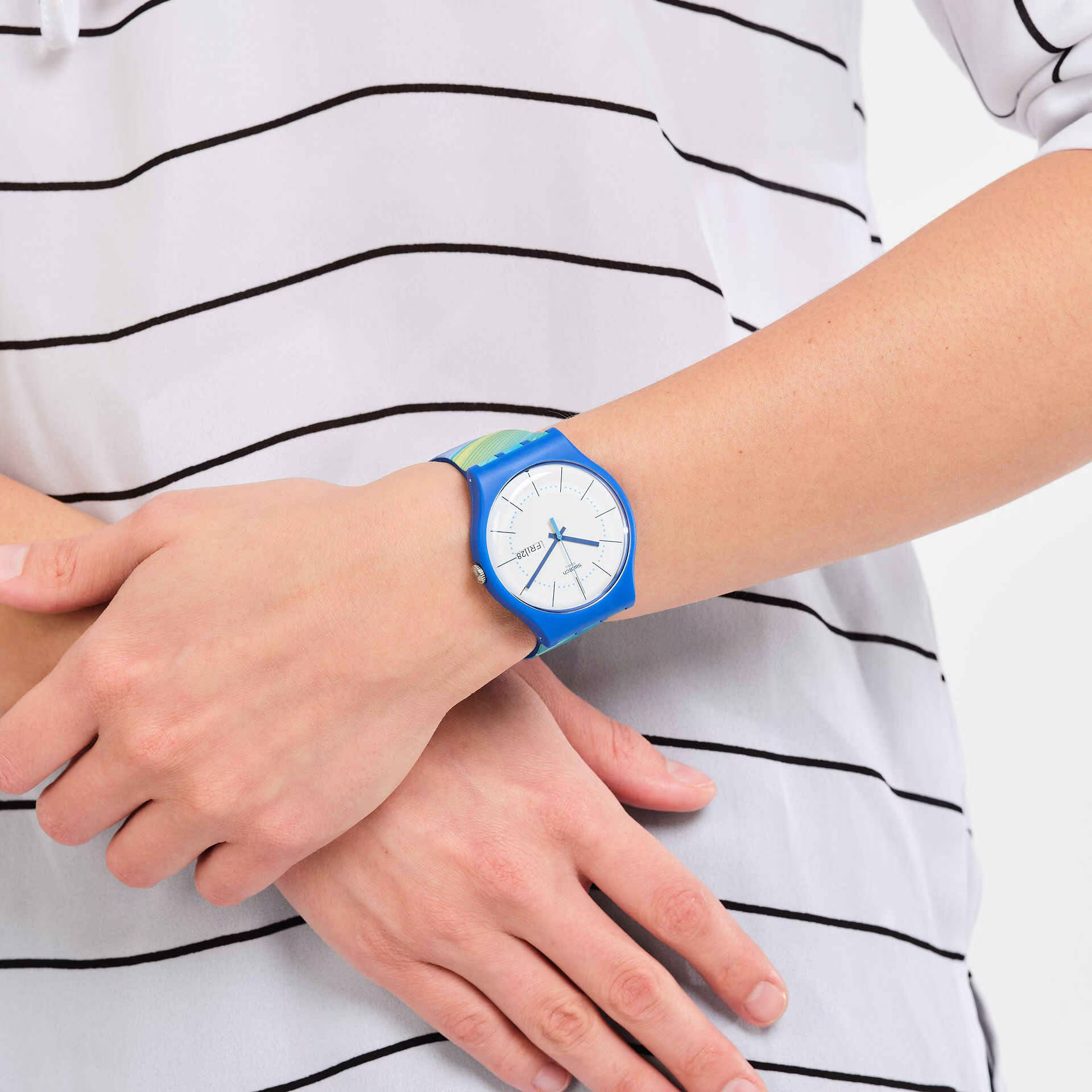 Эти олимпийские часы завоевали золото благодаря синему матовому корпусу из биоматериалов, синему силиконовому ремешку с зимним принтом и белому циферблату с синими индексами.