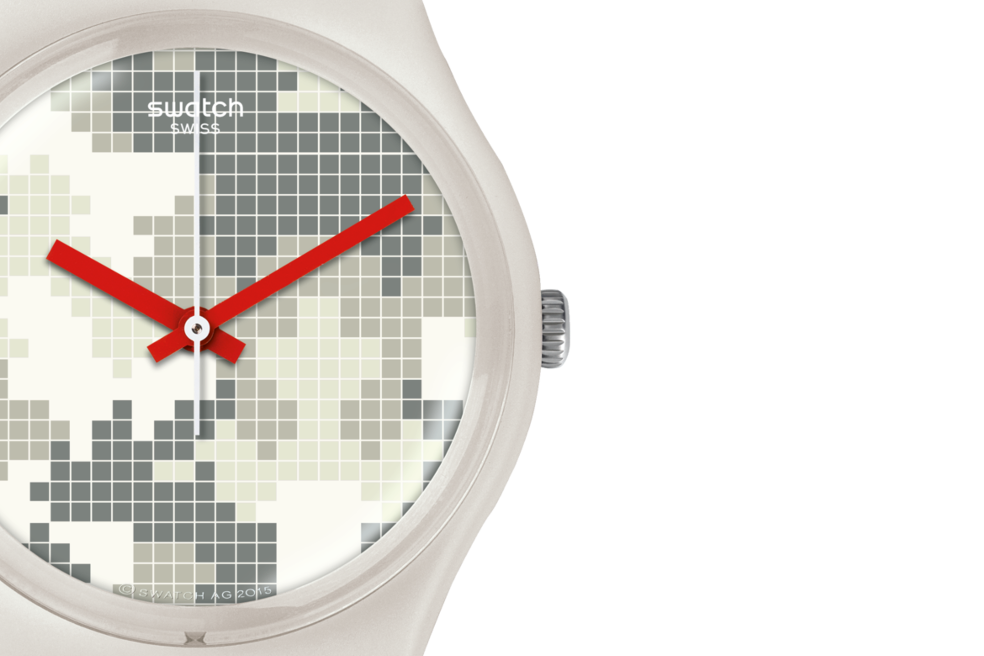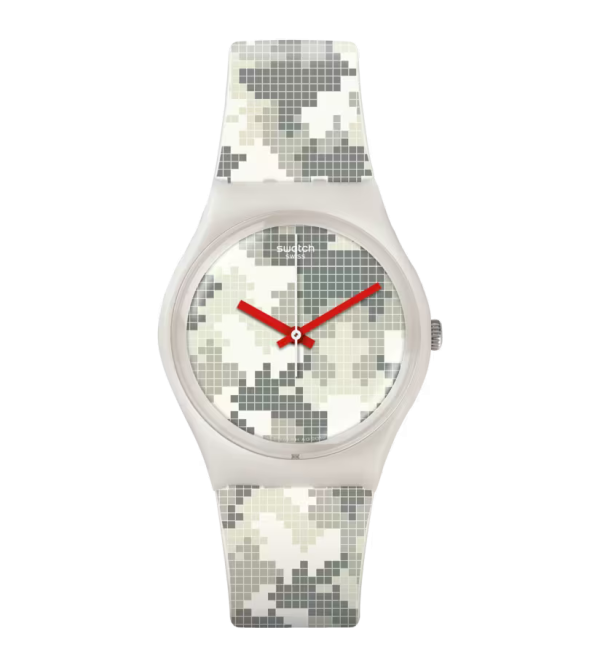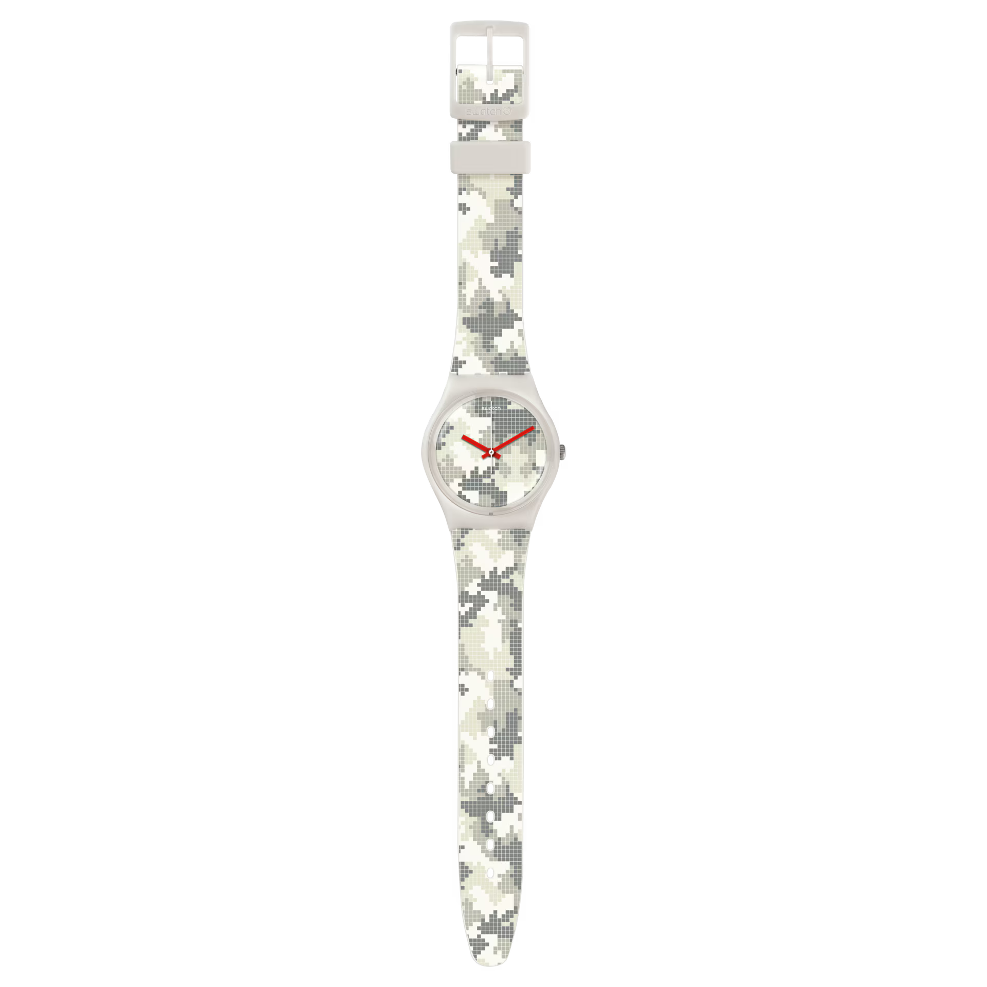 PIXELISE ME (GW180). Абстрактный камуфляжный принт, пикселизированный в тональном белом и сером цвете, от циферблата с красными стрелками до силиконового ремешка. Корпус из матового бежевого металла, петля и застежка того же цвета.