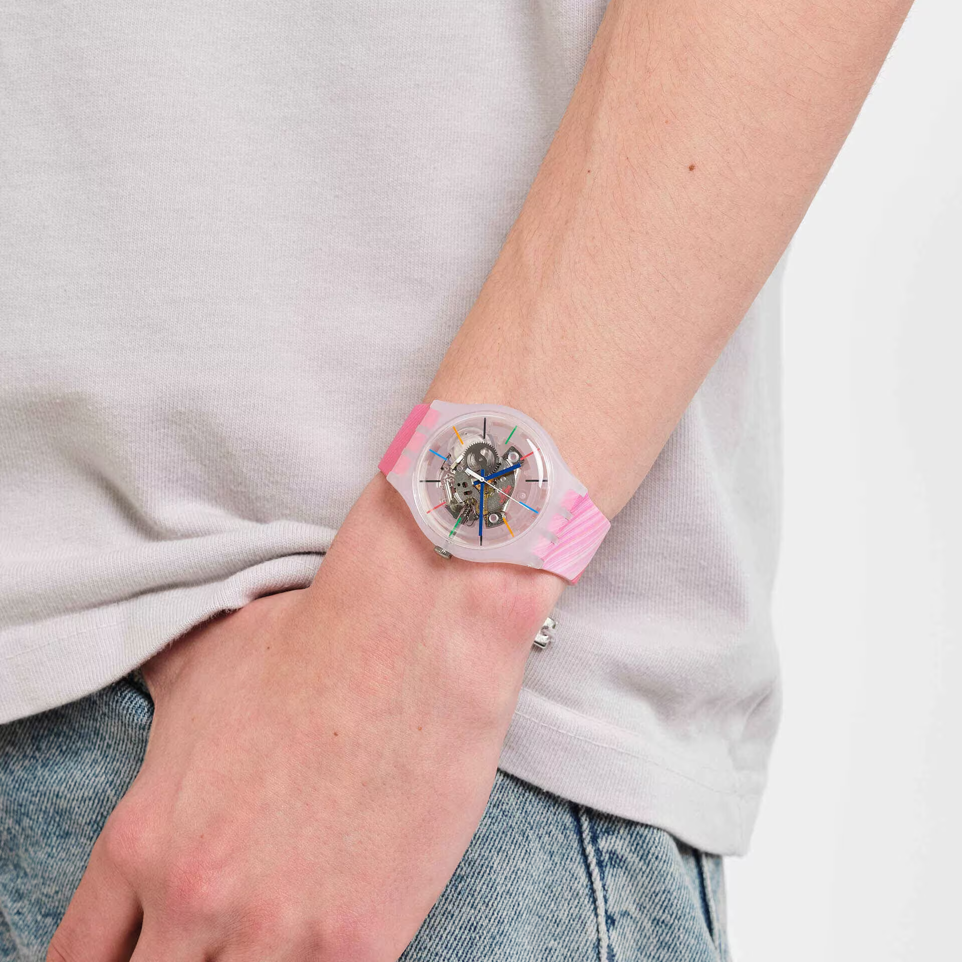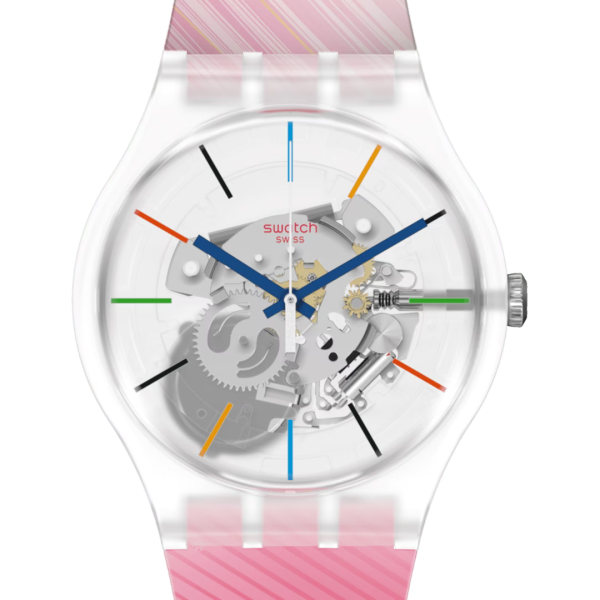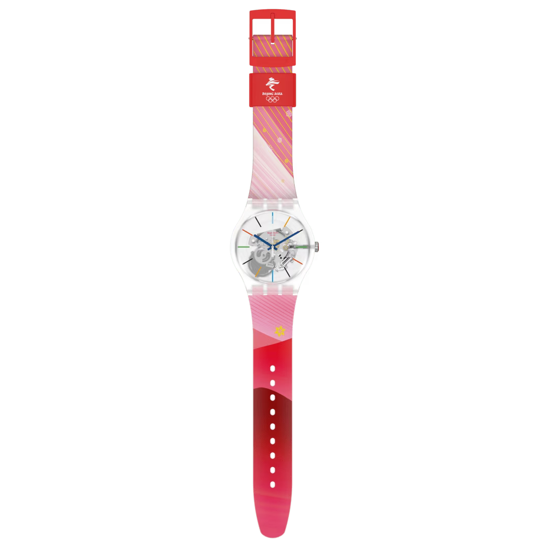 Эти часы воплощают магию зимних Олимпийских игр в Пекине благодаря прозрачному корпусу из биоматериалов, красному силиконовому ремешку и стрелкам и индексам в олимпийских цветах.