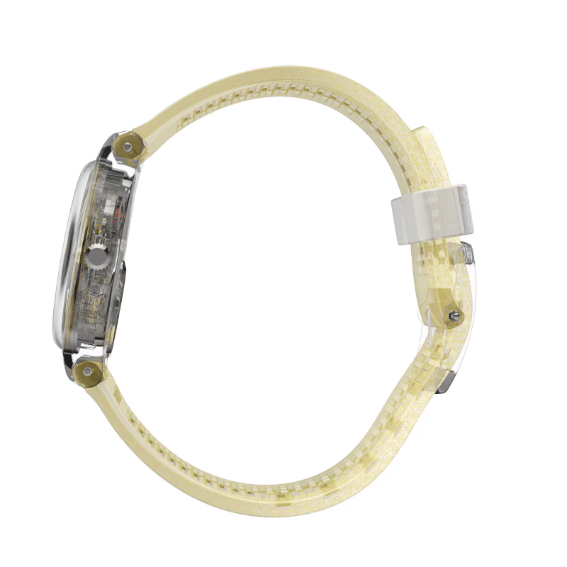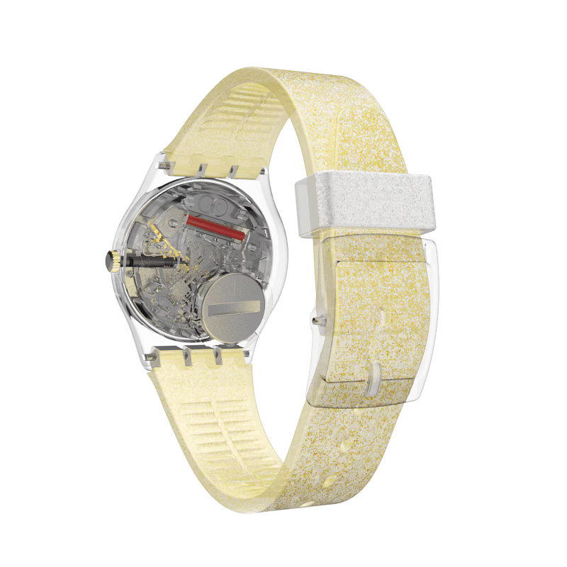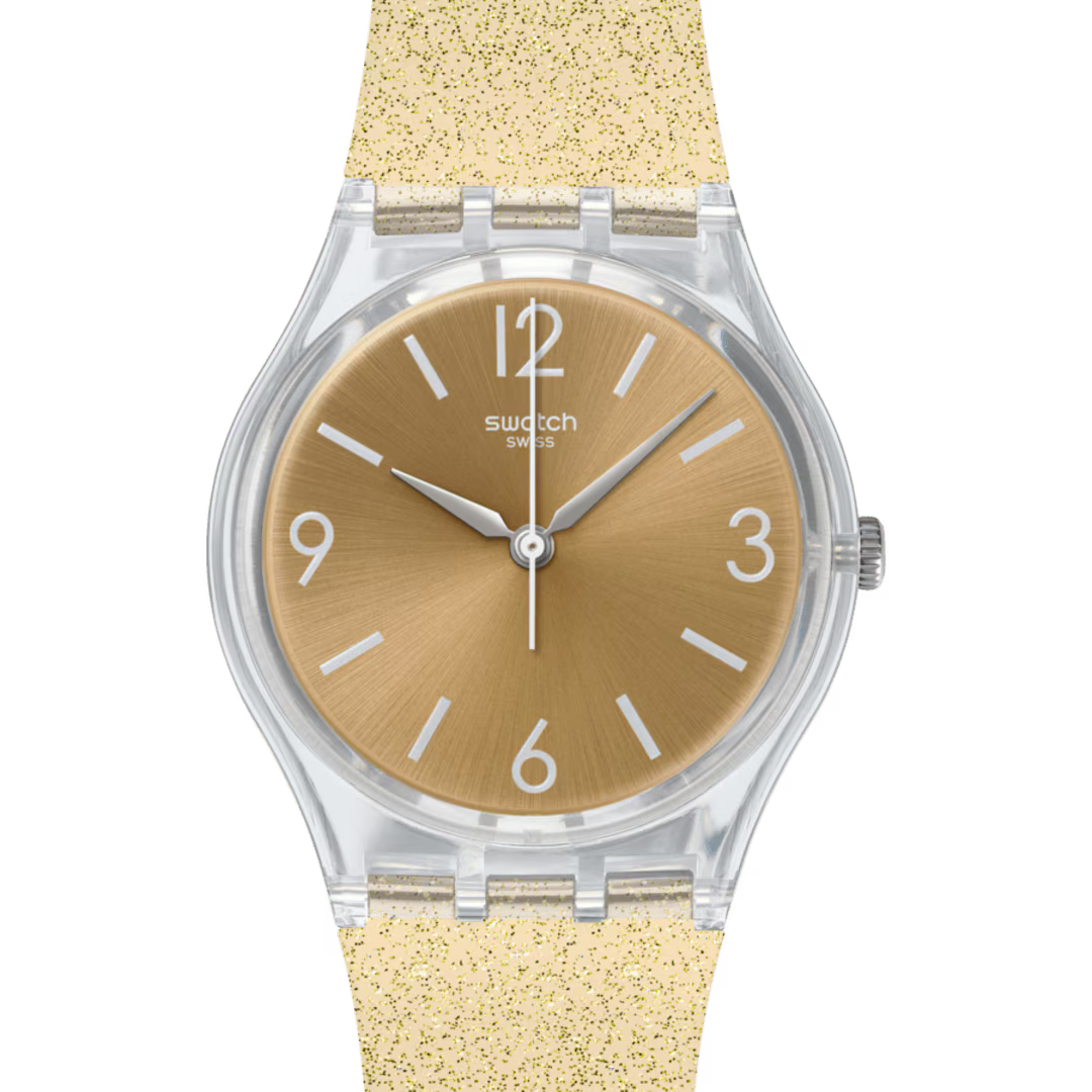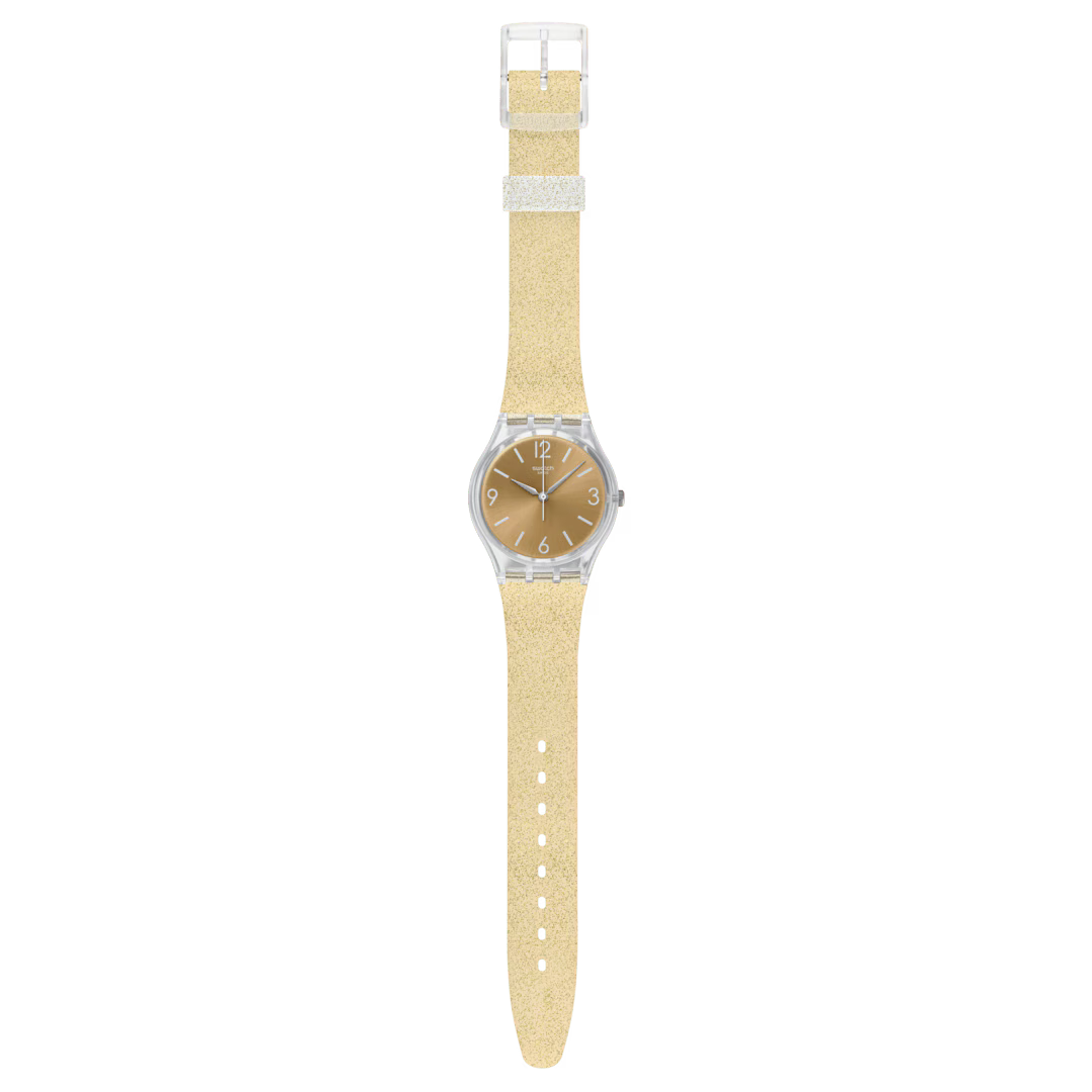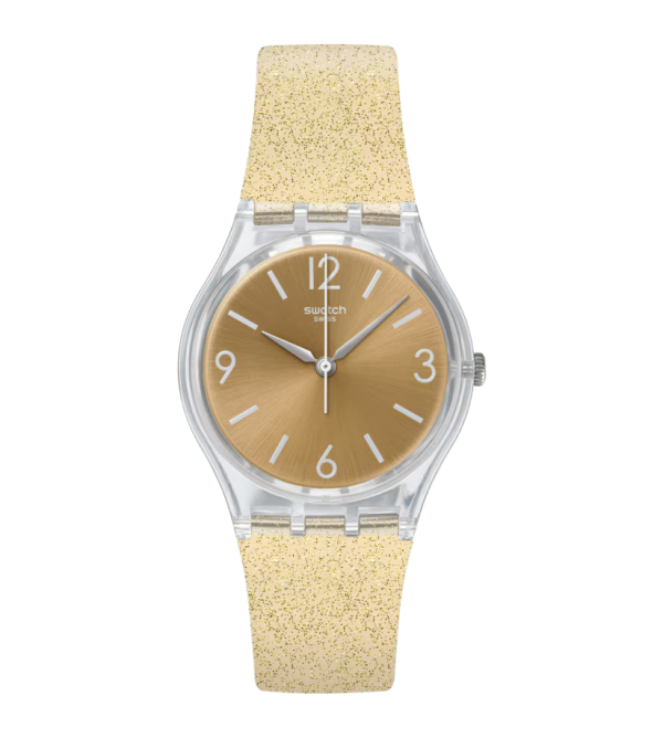 SUNBLUSH GE242C — это стильные часы от Swatch из коллекции The Originals в линейке Look Fab, предназначенные для унисекс-носки с размером корпуса Gent (34 мм). Модель оснащена швейцарским кварцевым механизмом с обычным трехстрелочным отображением времени (часы, минуты, секунды), прозрачным пластиковым корпусом и ремешком из силикона с золотистым блеском и glitter-эффектом, золотисто-медным циферблатом в стиле sunburst с серебристыми стрелками и арабскими/индексными метками, а также водозащитой 3 BAR (подходит для брызг, но не для плавания).