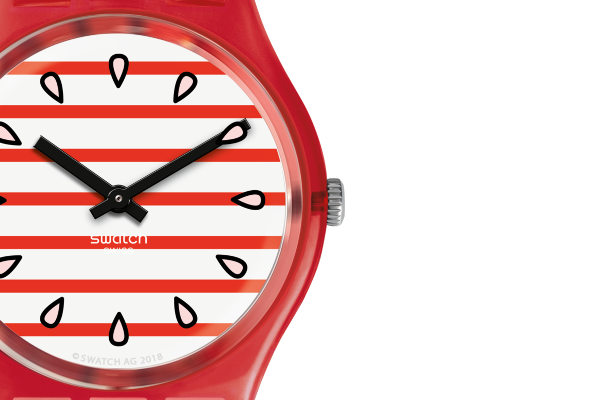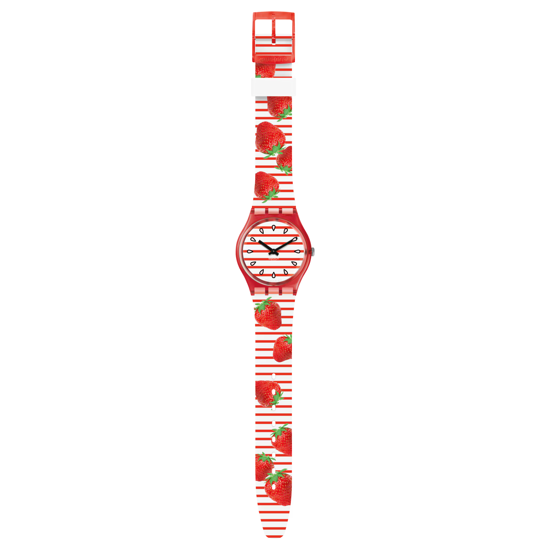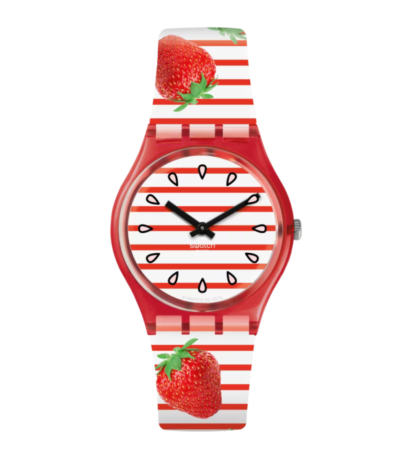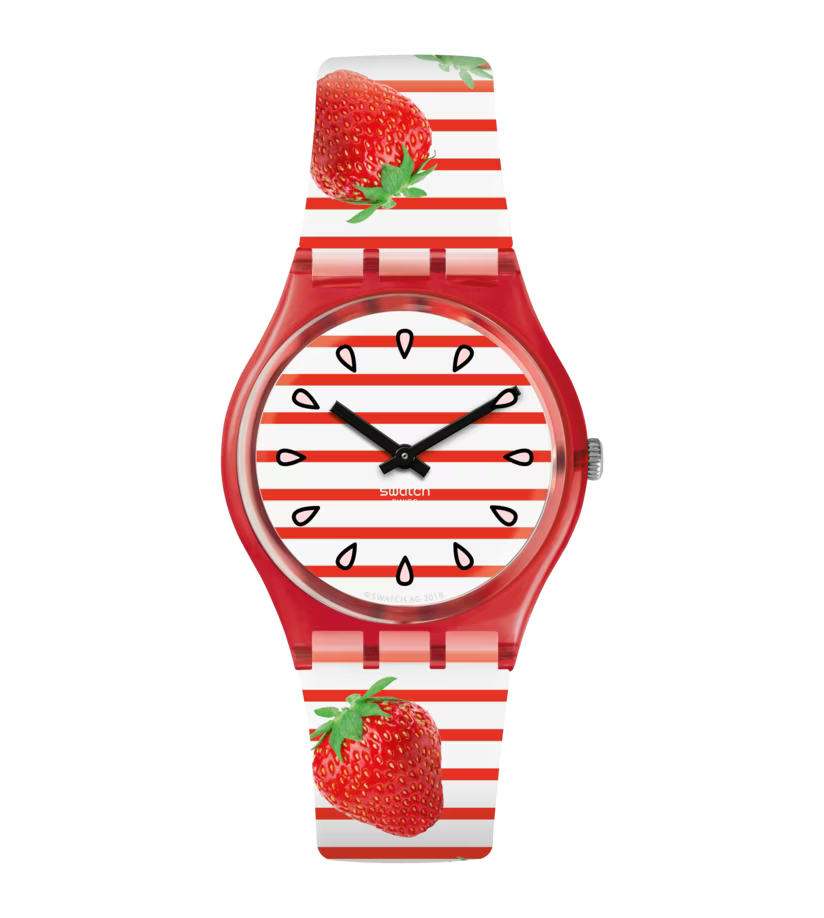 С часами TOILE FRAISEE (GR177) на запястье хорошие дни не закончатся никогда. На полосатом ремешке изображены вкусные клубники, напоминающие о пикниках в парке. Прозрачный красный корпус идеально сочетается с красно-белым полосатым циферблатом, украшенным семечками клубники!