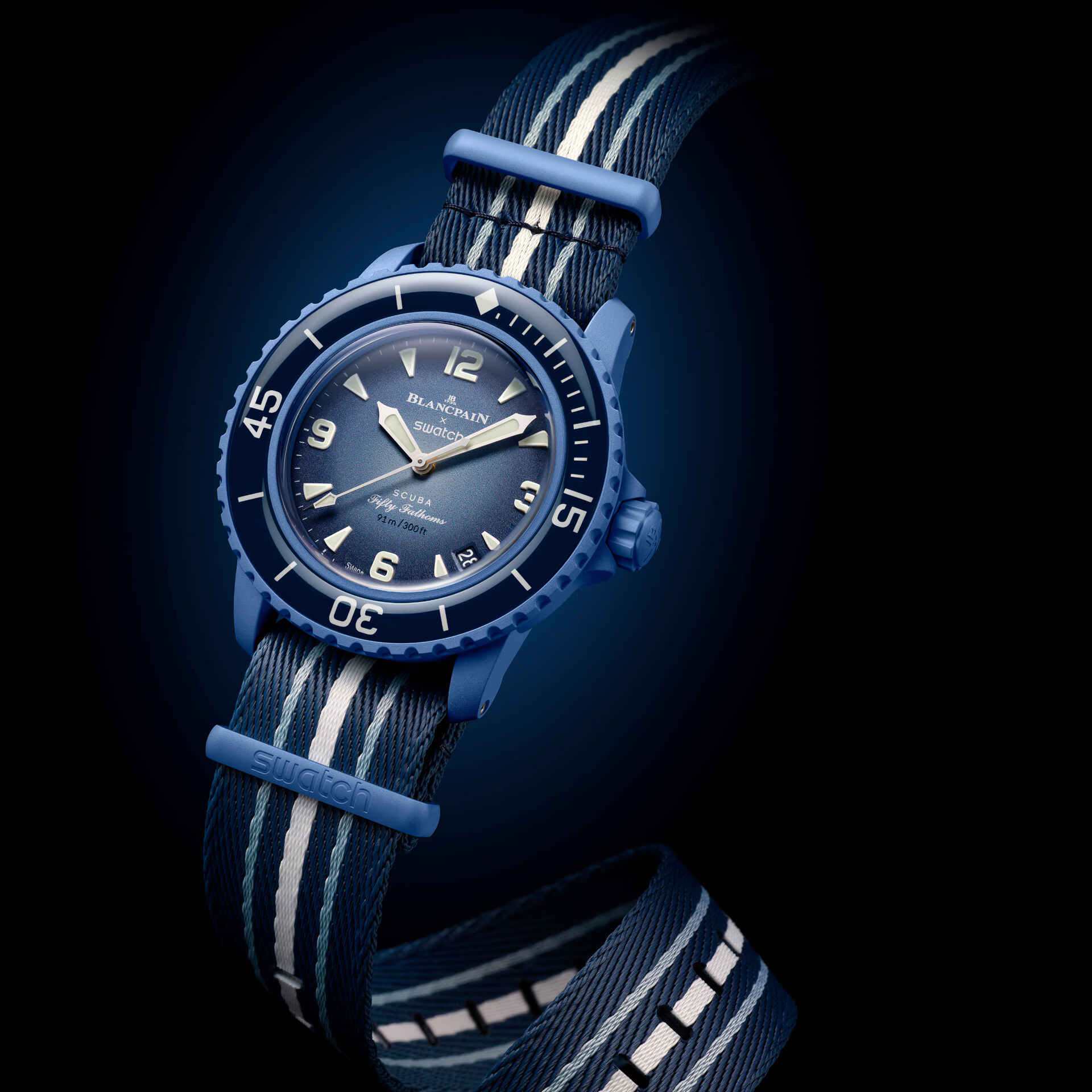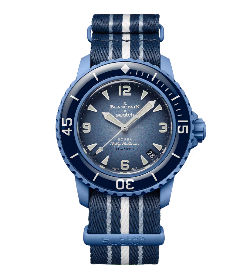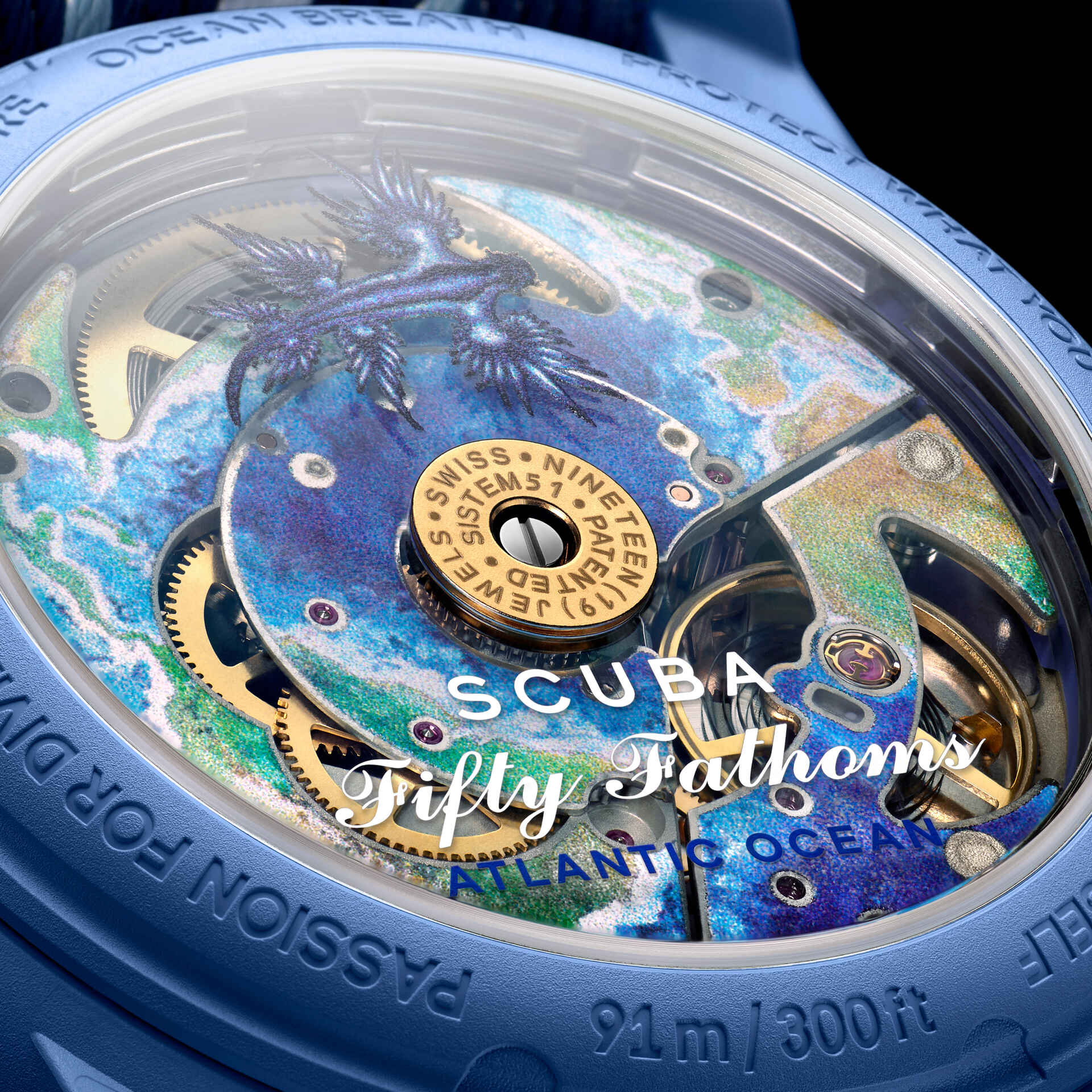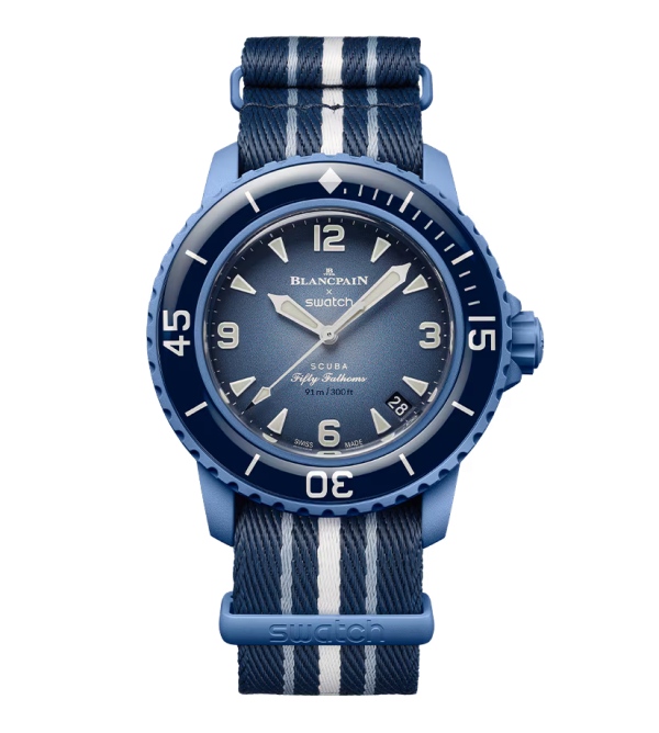 Эти часы Blancpain X Swatch являются данью уважения модели Fifty Fathoms от Blancpain, первым настоящим часам для дайверов. Их синий корпус и заводная головка изготовлены из биокерамического материала. На внешней левой стороне корпуса выгравирована надпись «Swatch». Металлический циферблат напечатан в несколько цветов для создания градиентного эффекта. Часовые индексы, часовая и минутная стрелки, а также шкала на безеле покрыты слоем Super-LumiNova® класса A, что обеспечивает отличную читаемость в темноте. Часы оснащены однонаправленным биокерамическим безелем океанического синего цвета и стеклом биологического происхождения. Механизм SISTEM51 виден благодаря прозрачному сапфировому стеклу и украшен цифровой печатью с изображением Атлантического океана и голожаберника Glaucus Atlanticus. На задней крышке часов можно найти пять вдохновляющих надписей: PASSION FOR DIVING (СТРАСТЬ К ПОДВОДНОМУ ПЛАВАНИЮ) – LICENCE TO EXPLORE (ЛИЦЕНЗИЯ НА ИССЛЕДОВАНИЯ) – OCEAN BREATH (ДЫХАНИЕ ОКЕАНА) – PROTECT WHAT YOU LOVE (ЗАЩИЩАЙ ТО, ЧТО ЛЮБИШЬ) и IMMERSE YOURSELF (ПОГРУЗИСЬ В СЕБЯ). Ремешок NATO изготовлен из переработанных рыболовных сетей, извлеченных из моря. Пряжка и петли изготовлены из биокерамического материала.