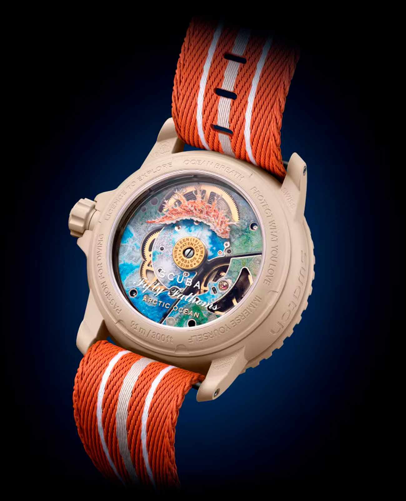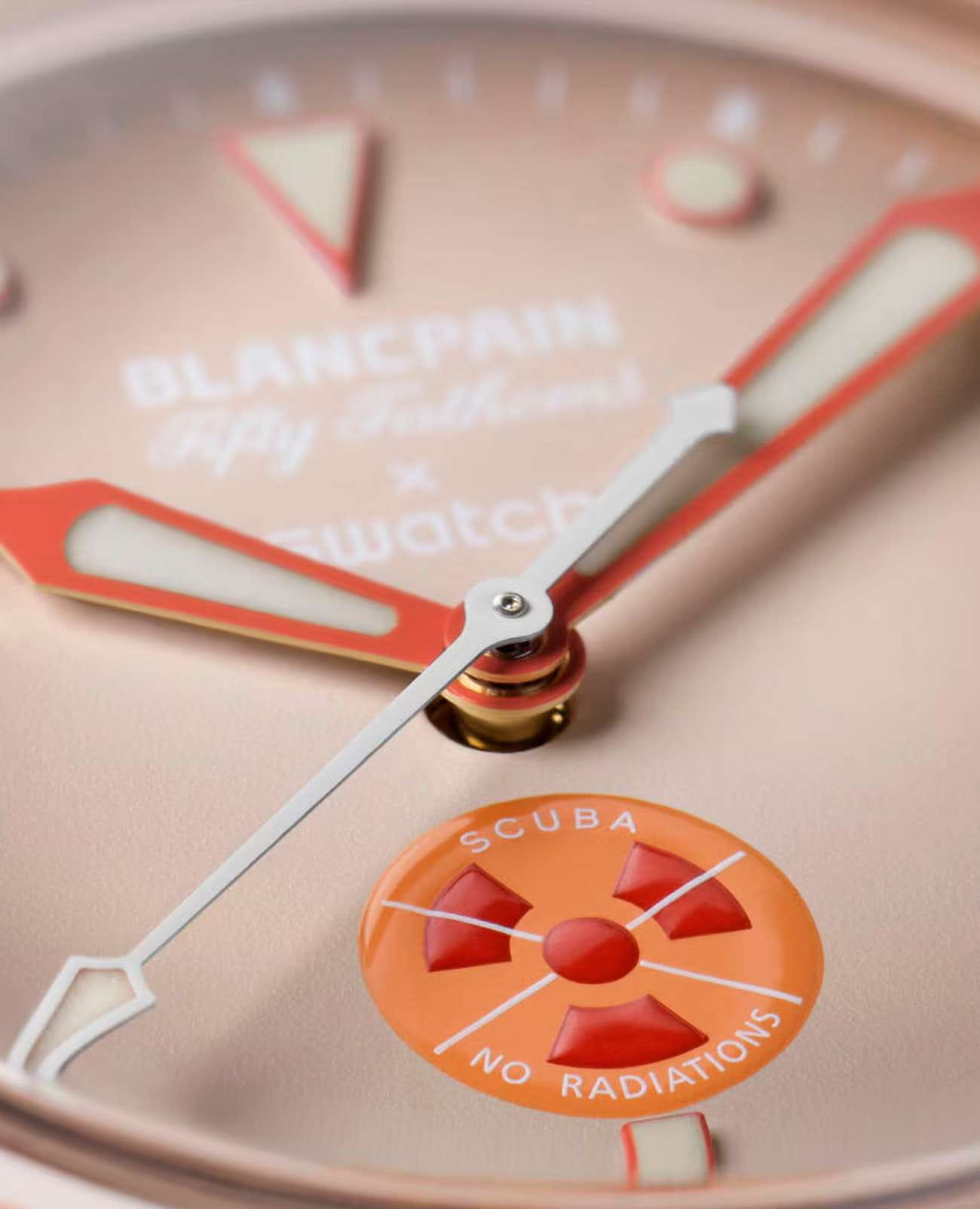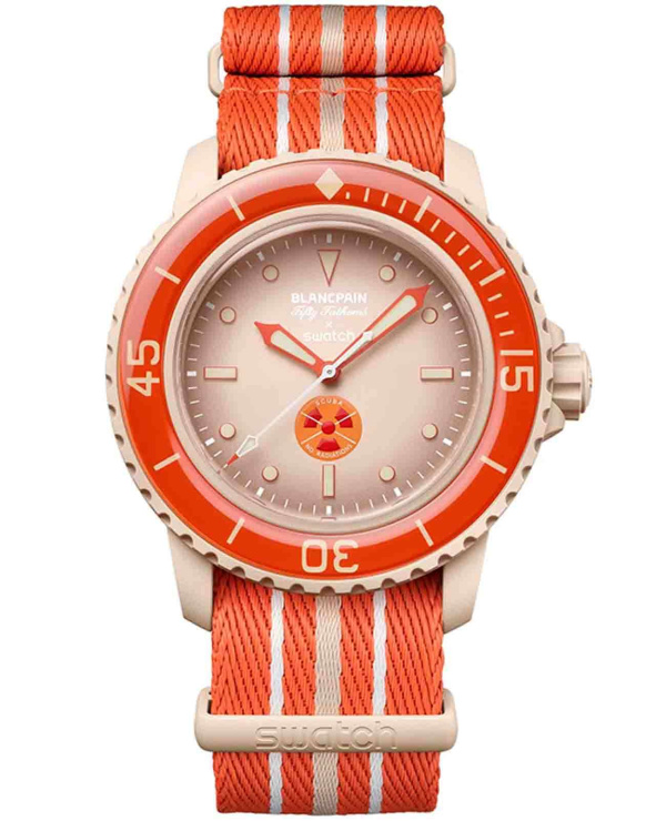 Эти часы Blancpain X Swatch являются данью уважения модели Fifty Fathoms от Blancpain, первым настоящим часам для дайверов. Их бежевый корпус и заводная головка изготовлены из биокерамического материала. На внешней левой стороне корпуса выгравирована надпись «Swatch». Циферблат отличается потрясающим градиентным эффектом, достигнутым за счет нанесения нескольких слоев тщательно подобранных цветов. В нижней части циферблата находится специальный символ: красный трилистник на желтом фоне с белым крестом, пересекающим его. Слова «NO RADIATIONS» под логотипом являются отсылкой к легендарному наследию Fifty Fathoms и богатой истории дайверских часов шестидесятых годов. Часовые индексы, часовая и минутная стрелки, а также шкала на безеле обогащены Super-LumiNova® класса A для отличной читаемости в темноте. Часы оснащены однонаправленным биокерамическим безелем бежевого цвета и стеклом биологического происхождения. Механический механизм SISTEM51 виден благодаря прозрачному сапфировому стеклу и украшен цифровой печатью с изображением Северного Ледовитого океана и голожаберника Dendronotus Frondosus. На задней крышке часов можно найти пять вдохновляющих надписей: PASSION FOR DIVING (СТРАСТЬ К ПОДВОДНОМУ ПЛАВАНИЮ) – LICENCE TO EXPLORE (ЛИЦЕНЗИЯ НА ИССЛЕДОВАНИЯ) – OCEAN BREATH (ДЫХАНИЕ ОКЕАНА) – PROTECT WHAT YOU LOVE (ЗАЩИЩАЙ ТО, ЧТО ЛЮБИШЬ) и IMMERSE YOURSELF (ПОГРУЗИСЬ В СЕБЯ). Ремешок NATO изготовлен из переработанных рыболовных сетей, извлеченных из моря. Пряжка и петли изготовлены из биокерамического материала.
