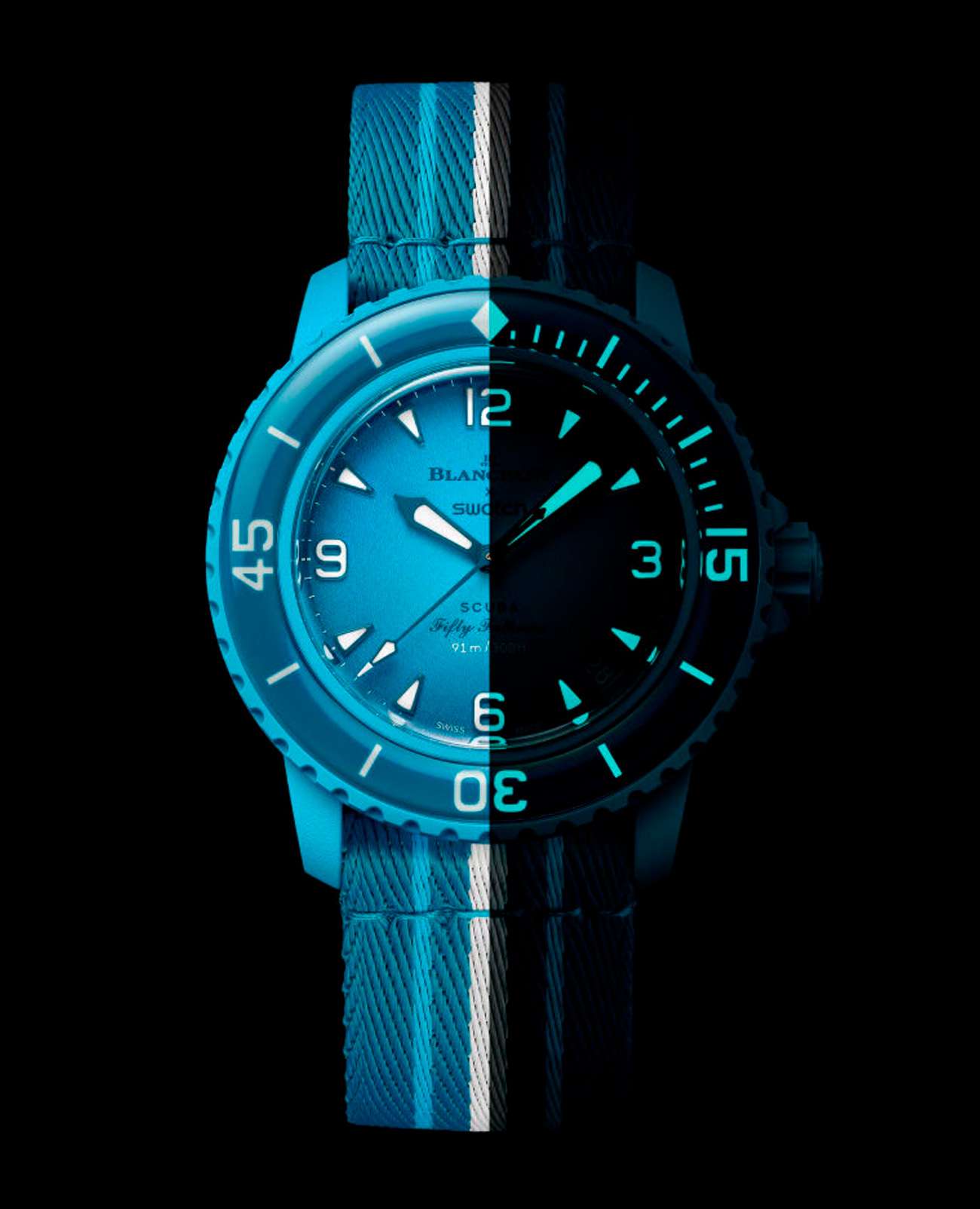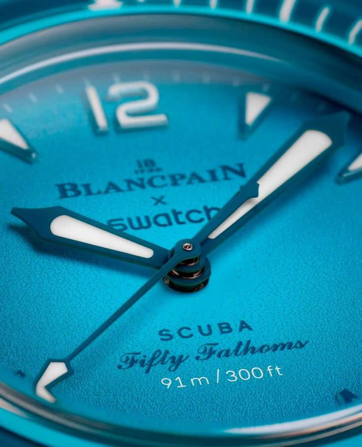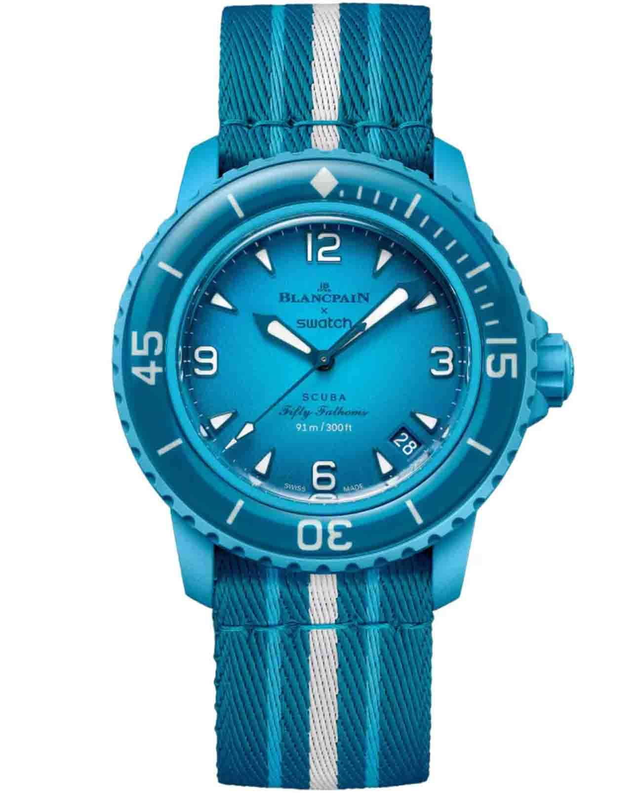 Эти часы Blancpain X Swatch являются данью уважения модели Fifty Fathoms от Blancpain, первым настоящим часам для дайверов. Их бирюзово-синий корпус и заводная головка изготовлены из биокерамического материала. На внешней левой стороне корпуса выгравирована надпись «Swatch». На циферблате с градиентным покрытием между 4 и 5 часами находится индикатор даты. Часовые индексы, часовая и минутная стрелки, кончик секундной стрелки, а также шкала на безеле покрыты слоем Super-LumiNova® класса A, что обеспечивает отличную читаемость в темноте. Часы оснащены темно-синим однонаправленным биокерамическим безелем и стеклом биологического происхождения. Механизм SISTEM51 виден через прозрачную заднюю крышку из сапфирового стекла и украшен цифровой печатью с изображением лагуны и голожаберника Tambja Mullineri. На задней крышке часов можно найти пять вдохновляющих надписей: PASSION FOR DIVING (СТРАСТЬ К ПОДВОДНОМУ ПЛАВАНИЮ) – LICENCE TO EXPLORE (ЛИЦЕНЗИЯ НА ИССЛЕДОВАНИЯ) – OCEAN BREATH (ДЫХАНИЕ ОКЕАНА) – PROTECT WHAT YOU LOVE (ЗАЩИЩАЙ ТО, ЧТО ЛЮБИШЬ) и IMMERSE YOURSELF (ПОГРУЗИСЬ В СЕБЯ). Двухсекционный ремешок в стиле NATO изготовлен из переработанных рыболовных сетей и обеспечивает полную видимость механизма. Пряжка и петли изготовлены из биокерамического материала.