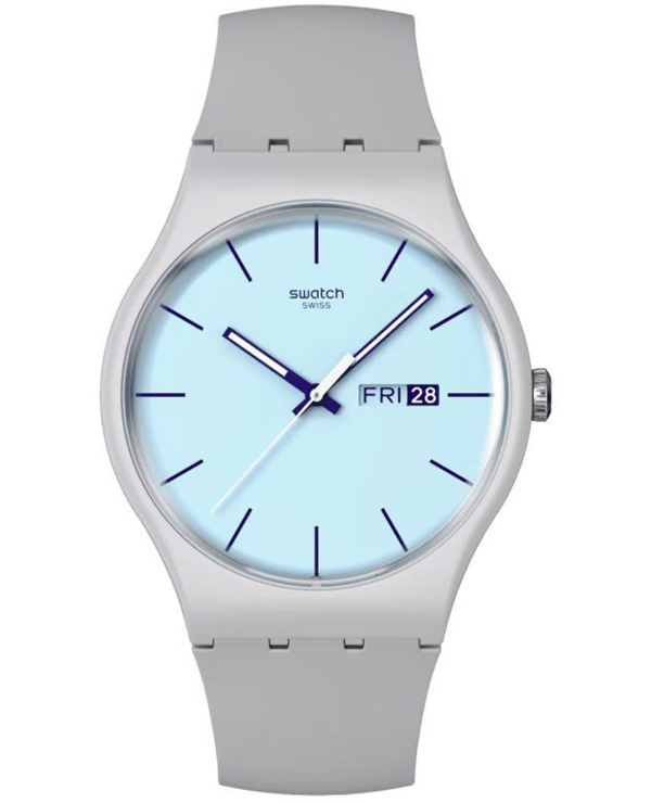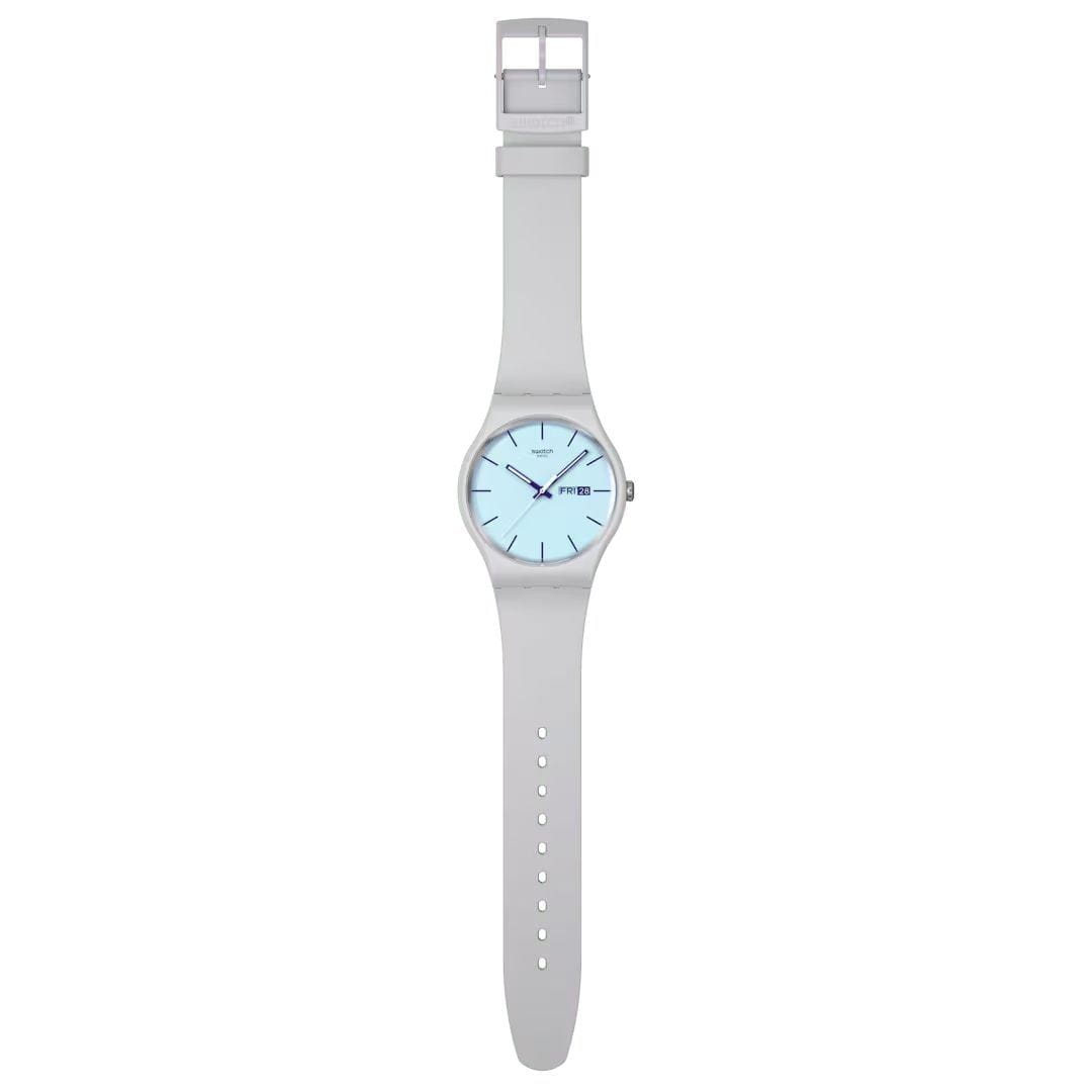 Светло-голубой циферблат этих часов украшен темно-фиолетовыми напечатанными индексами и окошком с указанием дня недели и даты в положении «3 часа». Темно-фиолетовые часовая и минутная стрелки со светящимся в темноте эффектом и белая секундная стрелка указывают время под стеклом из биоматериалов. Матовый светло-серый корпус из биоматериалов с ремешком, петлей и пряжкой в тон дополняют часы.