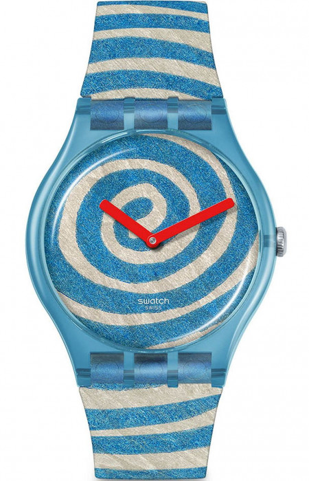 Эти часы из коллекции Swatch x Tate Gallery имеют прозрачный матовый синий корпус. На циферблате и матовом синем ремешке напечатано произведение Луиз Буржуа «СПИРАЛИ». Красные часовая и минутная стрелки указывают время, а на прозрачной матовой петле напечатан логотип Tate Gallery. Луиз Буржуа «СПИРАЛИ» 2005 (деталь) Серия из 12 гравюр на японской бумаге ручной работы.