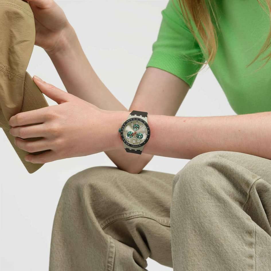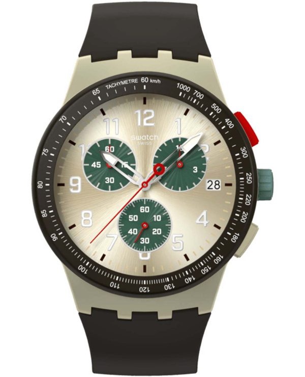 Этот хронограф привлекает внимание серебристым циферблатом c радиальной полировкой и тёмно-зелёными дополнительными циферблатами, светящимися в темноте часовой и минутной, красными секундной и вспомогательными стрелками, а также окошком указателем даты в положении между «4» и «3» часами. Матовый бежевый корпус располагает тёмно-коричневым безелем с белой тахиметрической шкалой и разноцветной заводной головкой и кнопками. Его дополняет матовый тёмно-коричневый ремешок с тренчиком в тон и матовая бежевая пряжка.