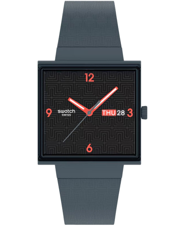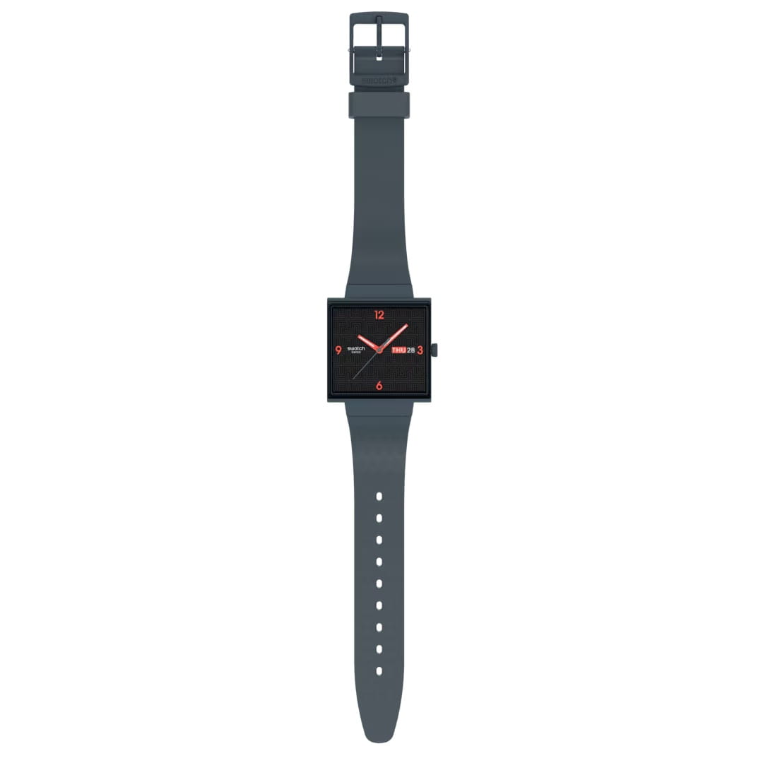 Эти часы имеют квадратный матовый темно-серый корпус из биокерамики с стеклом из биоматериалов от края до края, которое открывает вид на текстурированный черный циферблат. Циферблат имеет оранжевые напечатанные цифры, оранжевые часовую и минутную стрелки со светящимся в темноте эффектом, темно-серую секундную стрелку и окошко даты и дня недели в положении «3 часа». Текстурированный матовый темно-серый ремешок с матовой темно-серой петлей и матовой темно-серой биокерамической застежкой дополняет часы.