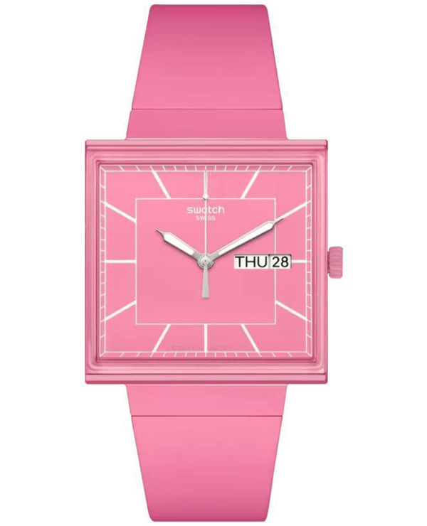 Квадратный корпус часов BIOCERAMIC rose оснащен стеклом из биоматериалов, которое простирается от края до края и позволяет увидеть белые индексы, напечатанные на часах. Квадратный циферблат имеет серебристые стрелки, светящиеся в темноте, и окошко с указанием дня недели и даты в положении «3 часа». Циферблат дополняет интегрированный ремешок из биоматериалов с застежкой BIOCERAMIC. На задней крышке с батарейным отсеком напечатан вид часов спереди.