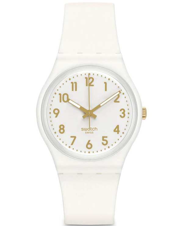 Часы минималистичного дизайна с золотистыми стрелками и цифрами на белом циферблате, белым корпусом и таким же ремешком.