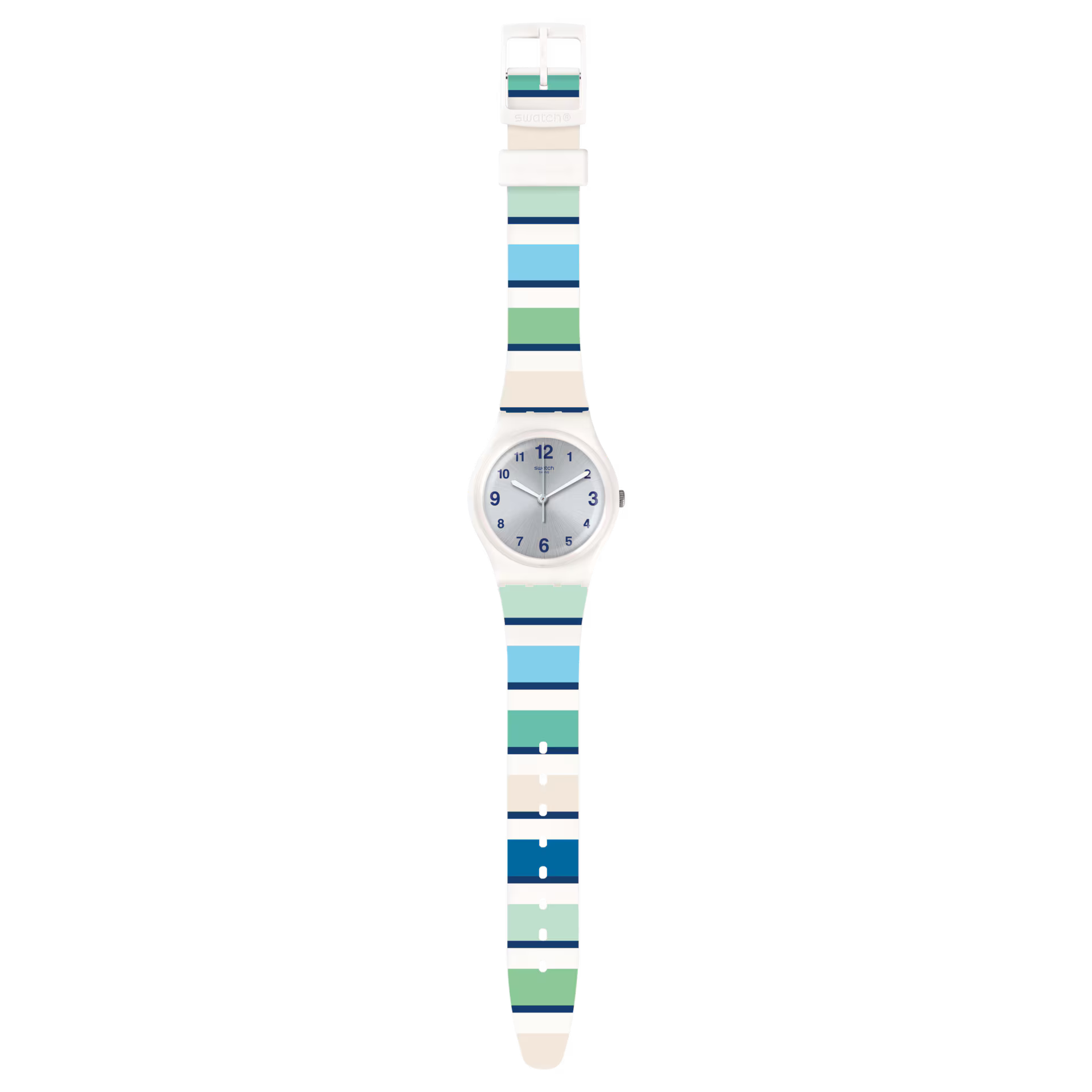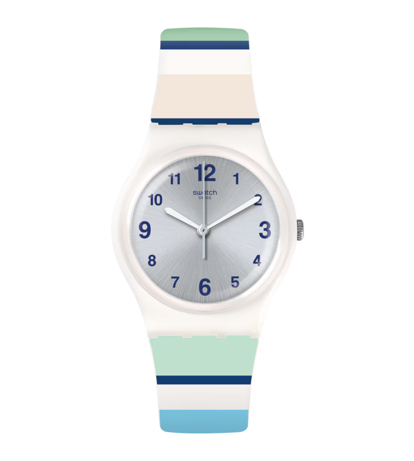 Почувствуйте энергию бескрайнего моря с часами Swatch MARINAI. Их дизайн — это настоящая ода лету: мягкий силиконовый ремешок украшен динамичным паттерном в глубоких синих и освежающих зеленых тонах, напоминающих игру прибрежных волн. Главным акцентом стал ослепительный серебристый циферблат с эффектом солнечных лучей (sun-brushed), который эффектно переливается на свету, словно блики солнца на воде. Компактный корпус и безупречный швейцарский механизм делают их не только стильным, но и надежным спутником для ваших самых ярких приключений. MARINAI — это ваш личный кусочек океана, который всегда рядом.