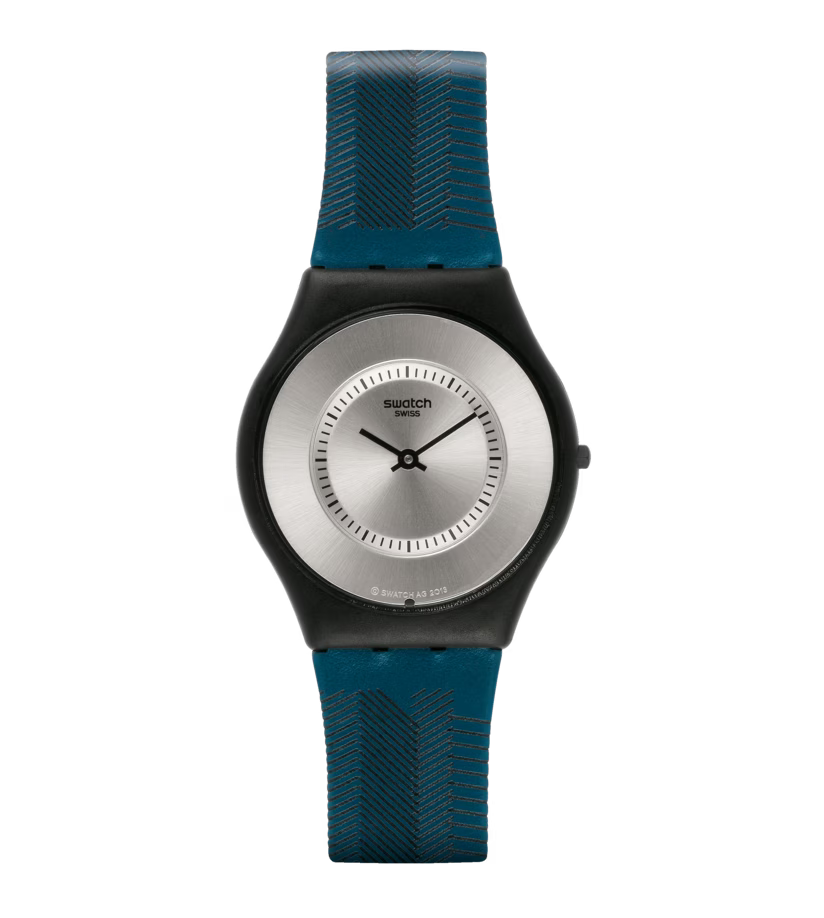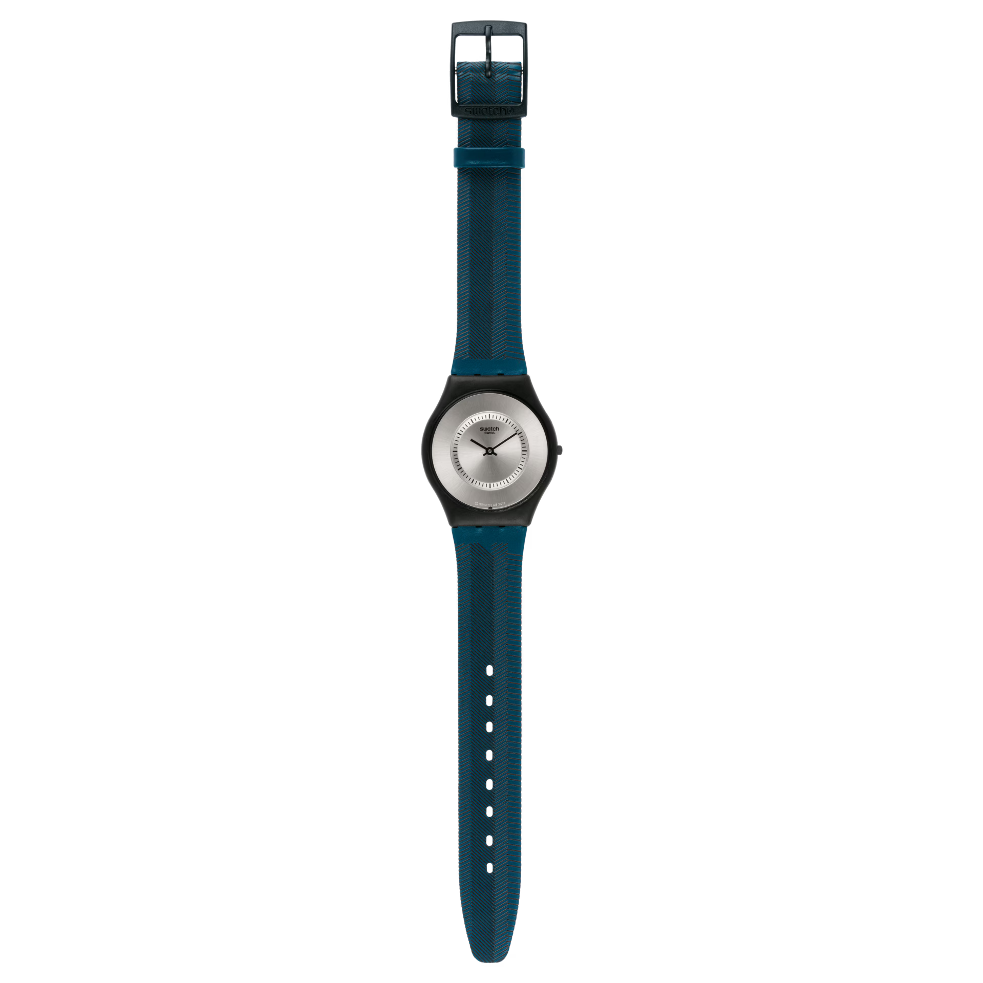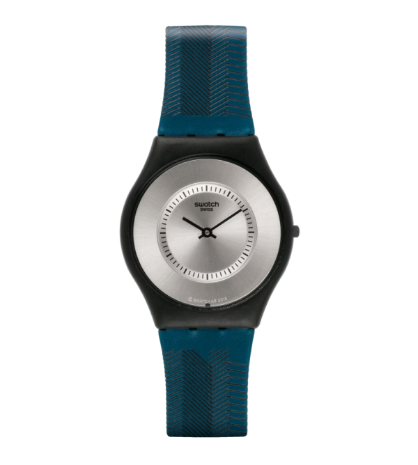 Swatch SFB143 (Petrol Energy) — это классические кварцевые часы из коллекции SKIN, с тонким корпусом и ремешком из кожи, featuring серый циферблат, черный полимерный корпус, синий ремешок и синий цвет циферблата, с водозащитой 30 м и минималистичным дизайном для женской аудитории.