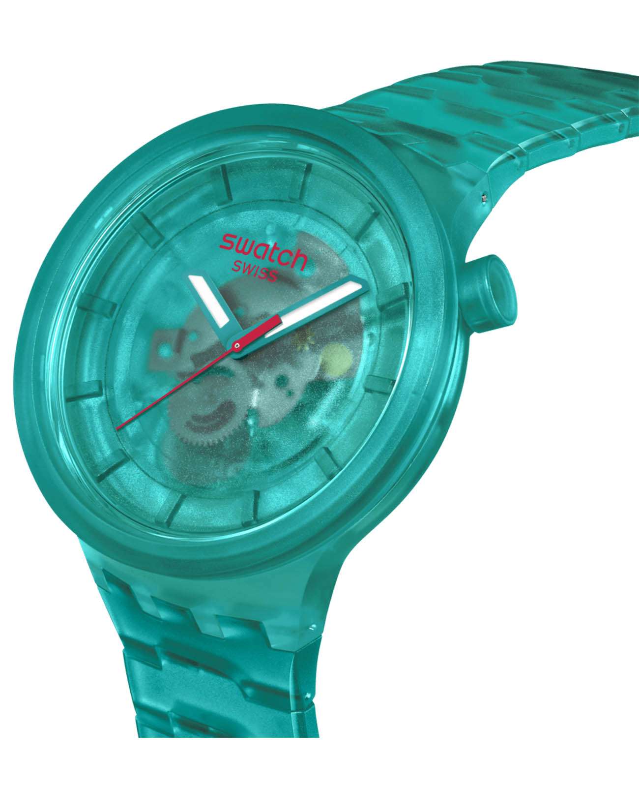 Все элементы этих крупных бирюзовых часов прозрачные: корпус из биоматериала, циферблат, безель и даже браслет с застежкой-бабочкой. Прозрачный бирюзовый циферблат, через который можно рассмотреть работу механизма, а также бирюзовые часовая и минутная стрелки, светящиеся в темноте, и секундная стрелка контрастной розовой расцветки защищены стеклом из биоматериала.