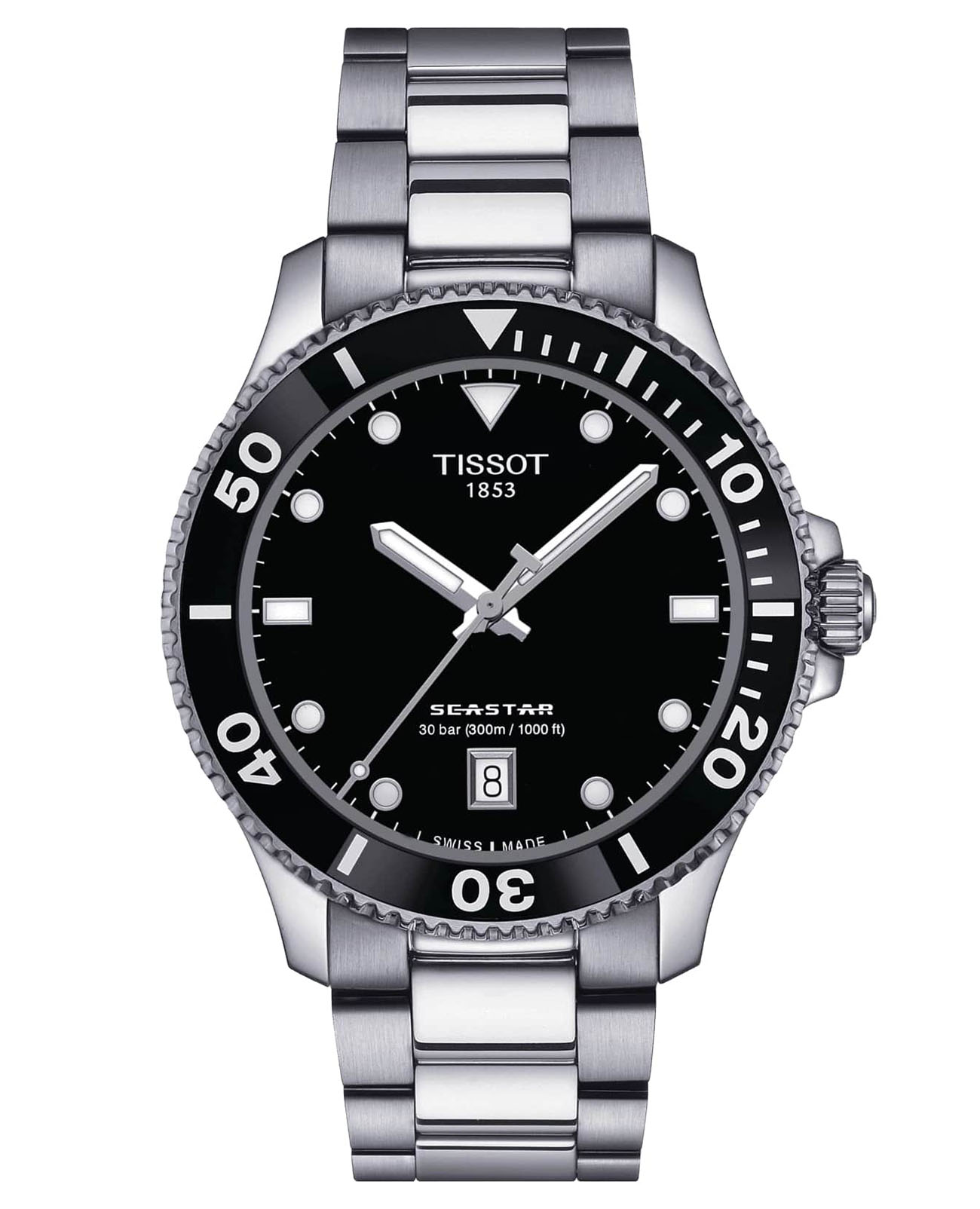 Мужские швейцарские часы Tissot Seastar 1000 T120.410.11.041.00 – это профессиональные кварцевые дайверские часы с 40-мм корпусом из нержавеющей стали и черным циферблатом, оснащенные высокоточным швейцарским кварцевым механизмом и водонепроницаемостью 300 метров. Модель отличается прочным сапфировым стеклом с антибликовым покрытием, черным керамическим безелем с минутной шкалой и фирменным морским коньком на задней крышке, что подчеркивает принадлежность к коллекции Seastar. Четкие люминесцентные метки и стрелки обеспечивают отличную читаемость под водой. Стальной браслет с раскладывающейся застежкой и двойной системой безопасности гарантирует надежную посадку на запястье. Эти часы сочетают в себе функциональность профессионального дайверского инструмента со стильным современным дизайном, предлагая владельцу непревзойденное швейцарское качество и надежность от Tissot.