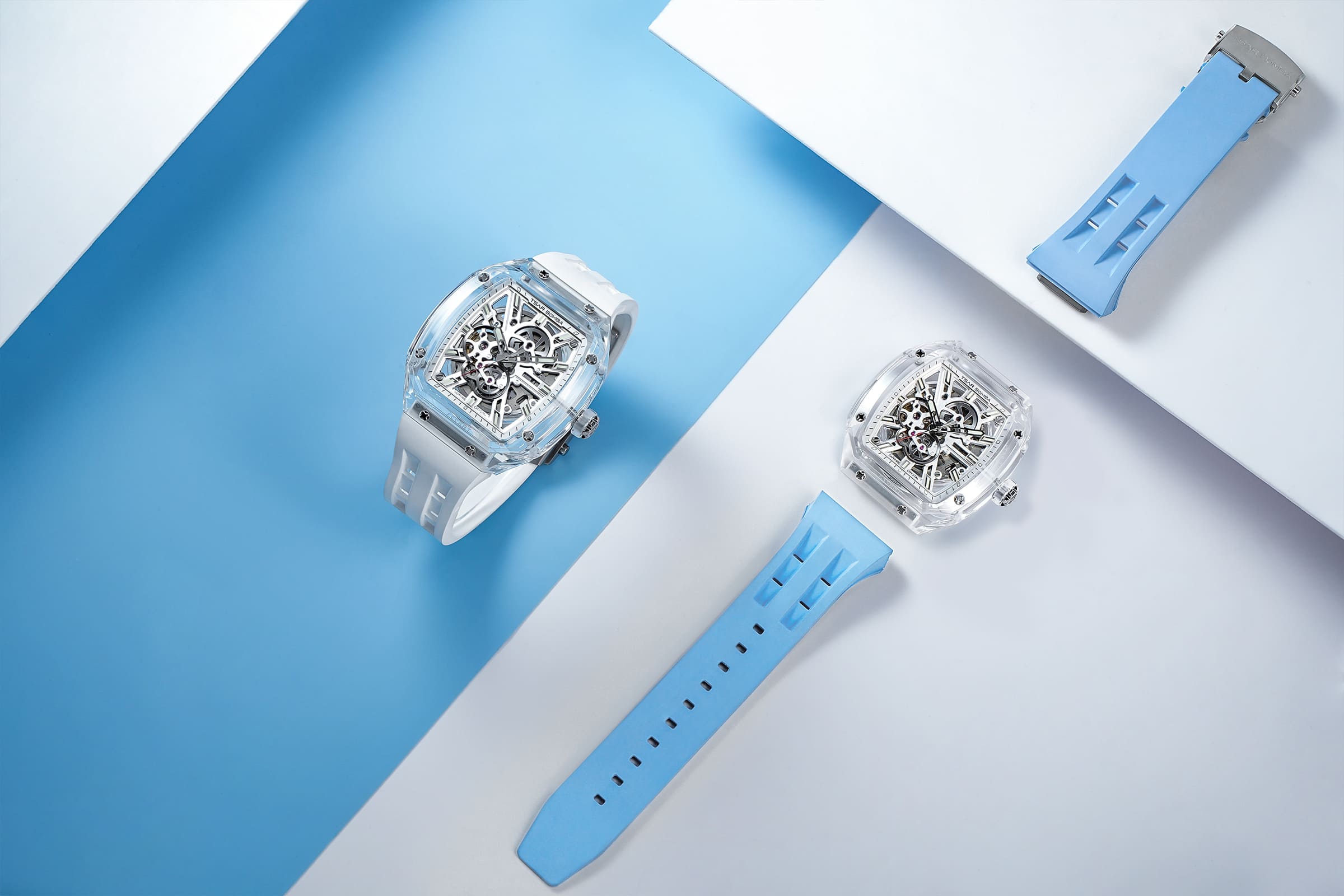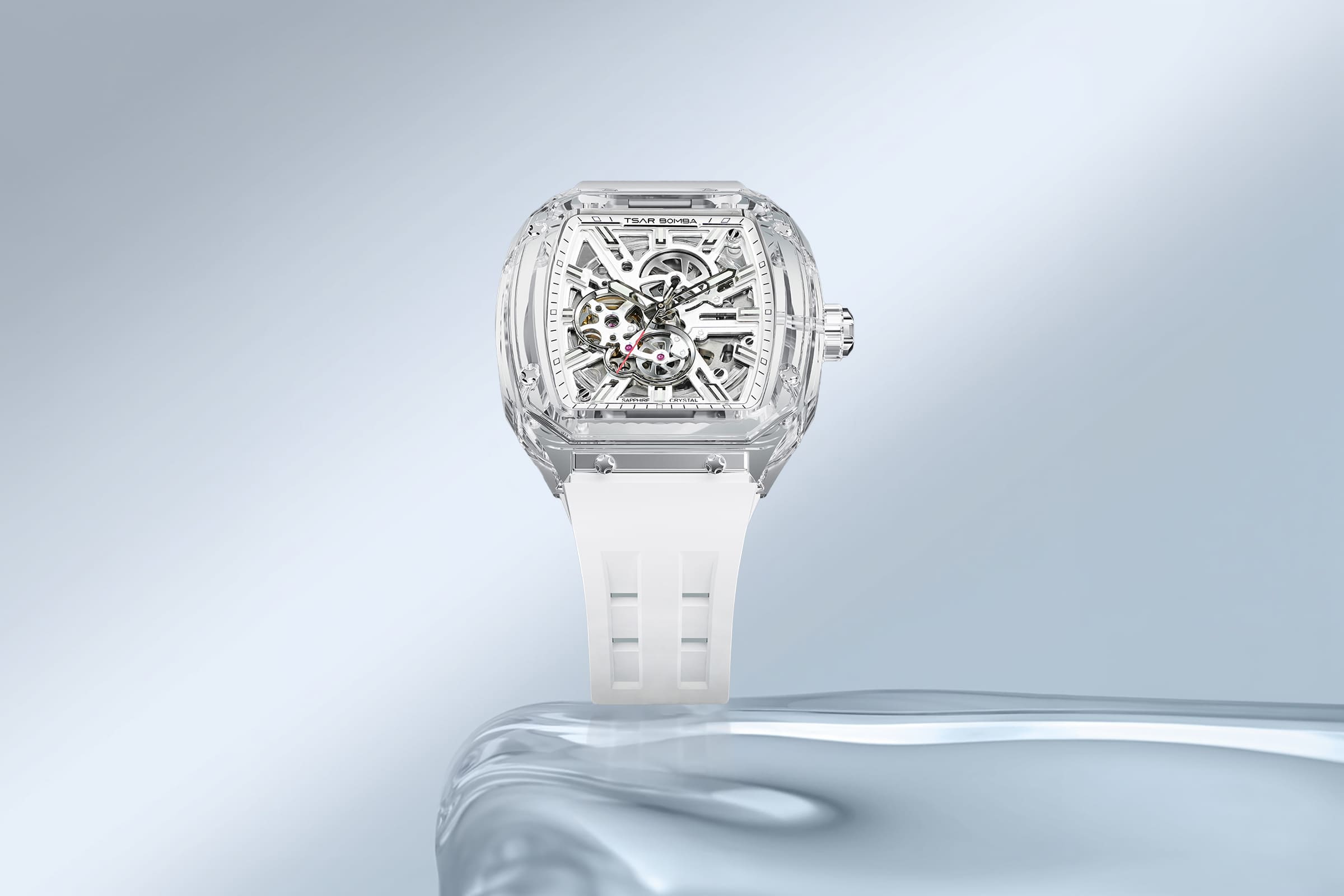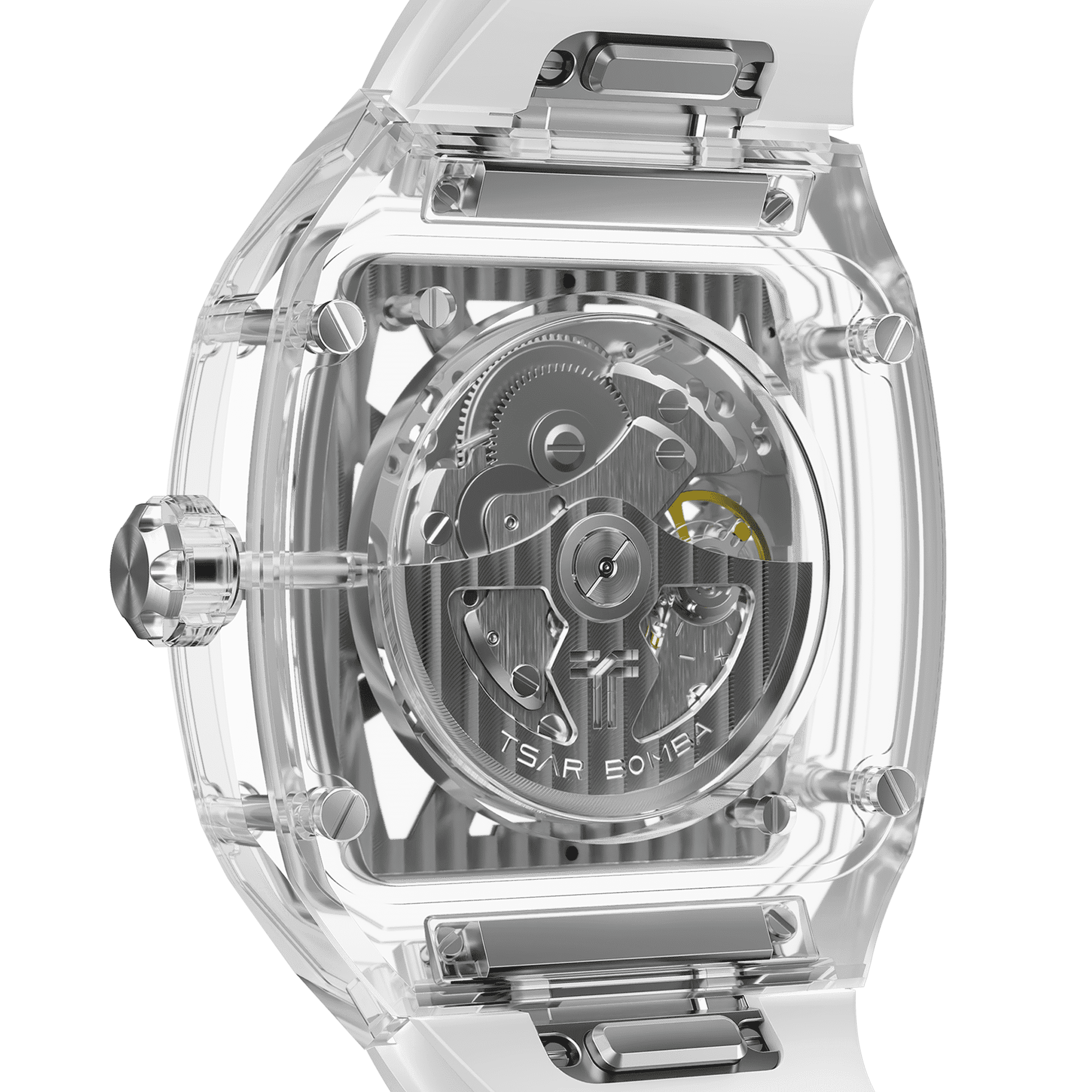 Модель Tsar Bomba Light Matter-Sapphire Crystal Edition TB8223 в данной конфигурации переходит в категорию серьезной часовой механики благодаря установке японского калибра Seiko NH70. Этот автоматический механизм с функцией скелетона специально разработан для того, чтобы демонстрировать работу пружин и шестерен, что в сочетании с корпусом из прозрачного Chronite® и сапфировым безелем создает захватывающее зрелище «живого» прибора на запястье. Использование NH70 добавляет часам приятную тяжесть ротора и статус истинной механики, которая заводится от движения руки и не требует замены батарейки. Весь этот ансамбль материалов и технологий превращает серию Light Matter в настоящий гимн прозрачности, где каждый нюанс движения деталей виден сквозь безупречный сапфир и высокотехнологичный композит.
