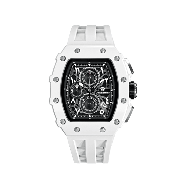 Мужские наручные часы с хронографом TSAR BOMBA Quartz Chrono Ceramic TB8204QA-01 представляют собой эксклюзивное сочетание современной инженерии и традиционной восточной эстетики. Главной особенностью этой модели является циферблат с арабскими символами (индо-арабскими цифрами), которые придают часам уникальный характер и подчеркивают их премиальный статус. Модель оснащена сверхпрочным безелем из высокотехнологичной керамики и устойчивым к царапинам сапфировым стеклом, защищающим сложный скелетонизированный механизм. Внутри скрывается надежный японский калибр Seiko VK67, обеспечивающий безупречную точность хронографа, а дополняет образ мягкий, износостойкий ремешок из фторкаучука. Эти часы станут идеальным выбором для тех, кто ищет редкое сочетание агрессивного спортивного стиля и утонченной арабской каллиграфии.в.