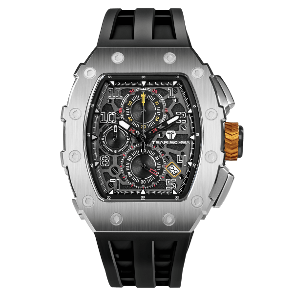 Мужские наручные часы TSAR BOMBA  представляют собой эффектный кварцевый хронограф в узнаваемом бочкообразном корпусе, вдохновленном эстетикой люксовых спортивных брендов. Модель оснащена надежным японским механизмом Seiko VK67, который обеспечивает точность хода и функциональность секундомера с приятным тактильным откликом. Особого внимания заслуживают материалы: корпус из нержавеющей стали 316L дополнен устойчивым к царапинам сапфировым стеклом, что редко встречается в данной ценовой категории, а мягкий ремешок из фторкаучука гарантирует комфортную посадку на запястье. Скелетонизированный циферблат с яркими акцентами подчеркивает современный индустриальный стиль, делая эти часы смелым аксессуаром для тех, кто ценит массивный дизайн и высокую детализацию.