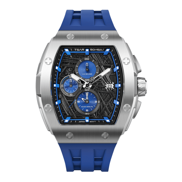 Мужские наручные часы Tsar Bomba TB8211QII-09 в эффектном исполнении с синим ремешком представляют собой динамичный хронограф, сочетающий в себе морскую эстетику и индустриальный хай-тек. Модель работает на базе высокоточного японского кварцевого механизма Epson YM92, который позволяет замерять интервалы времени с точностью до 1/20 доли секунды и фиксировать общую продолжительность до 12 часов. Стальной корпус в форме бочки, выполненный из нержавеющей стали 316L, надежно защищает сложный многоуровневый циферблат с помощью сверхпрочного сапфирового стекла. Глубокий синий цвет ремешка из премиального фторкаучука идеально гармонирует с акцентами на циферблате, создавая яркий, но при этом благородный образ. Благодаря водозащите 5 ATM и устойчивым к износу материалам, эти часы станут отличным выбором для тех, кто ищет надежный и заметный аксессуар для активного образа жизни.